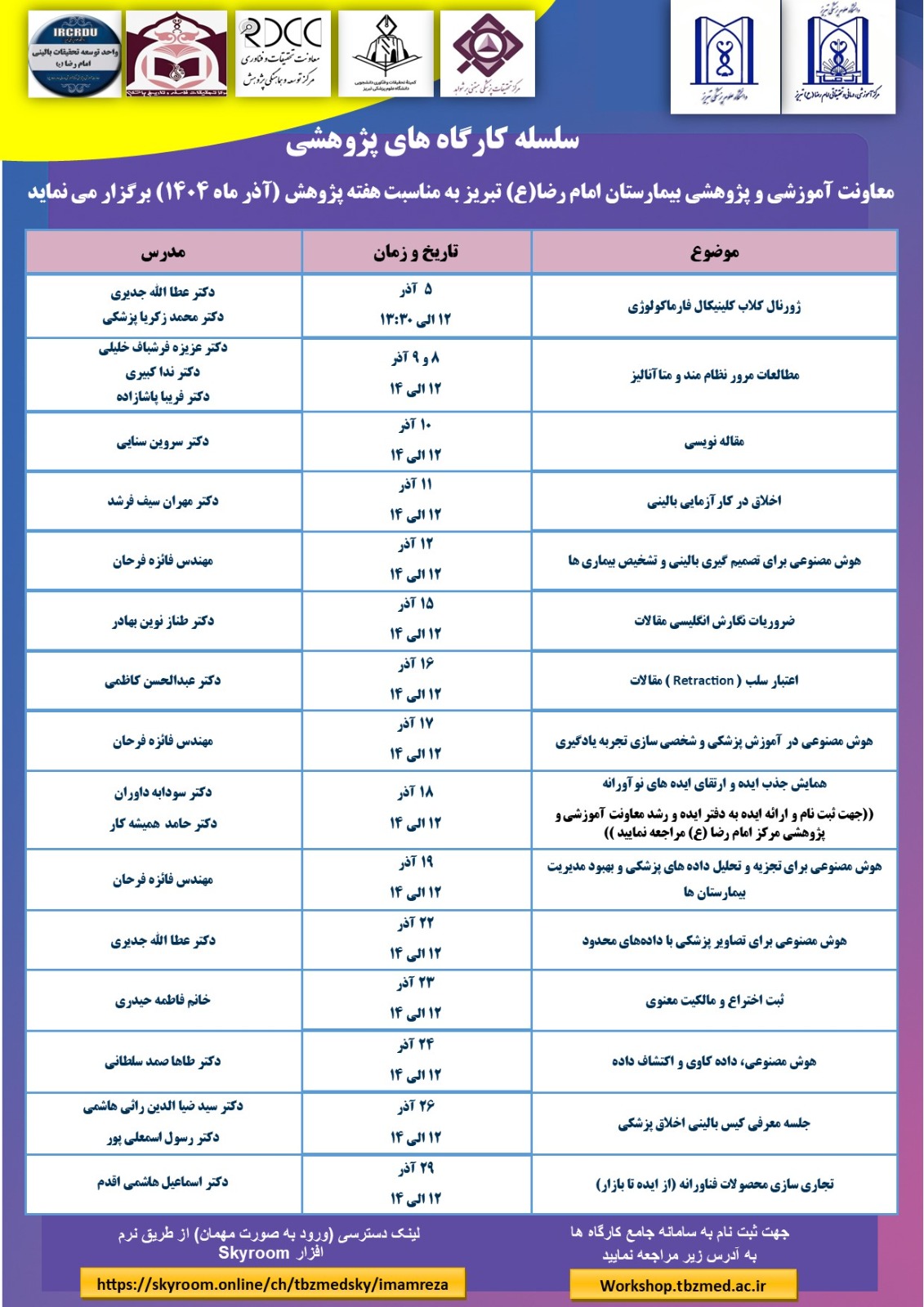 برنامه های سلسله کارگاههای پژوهشی بیمارستان امام رضا(ع) تبریز در آذرماه 1404