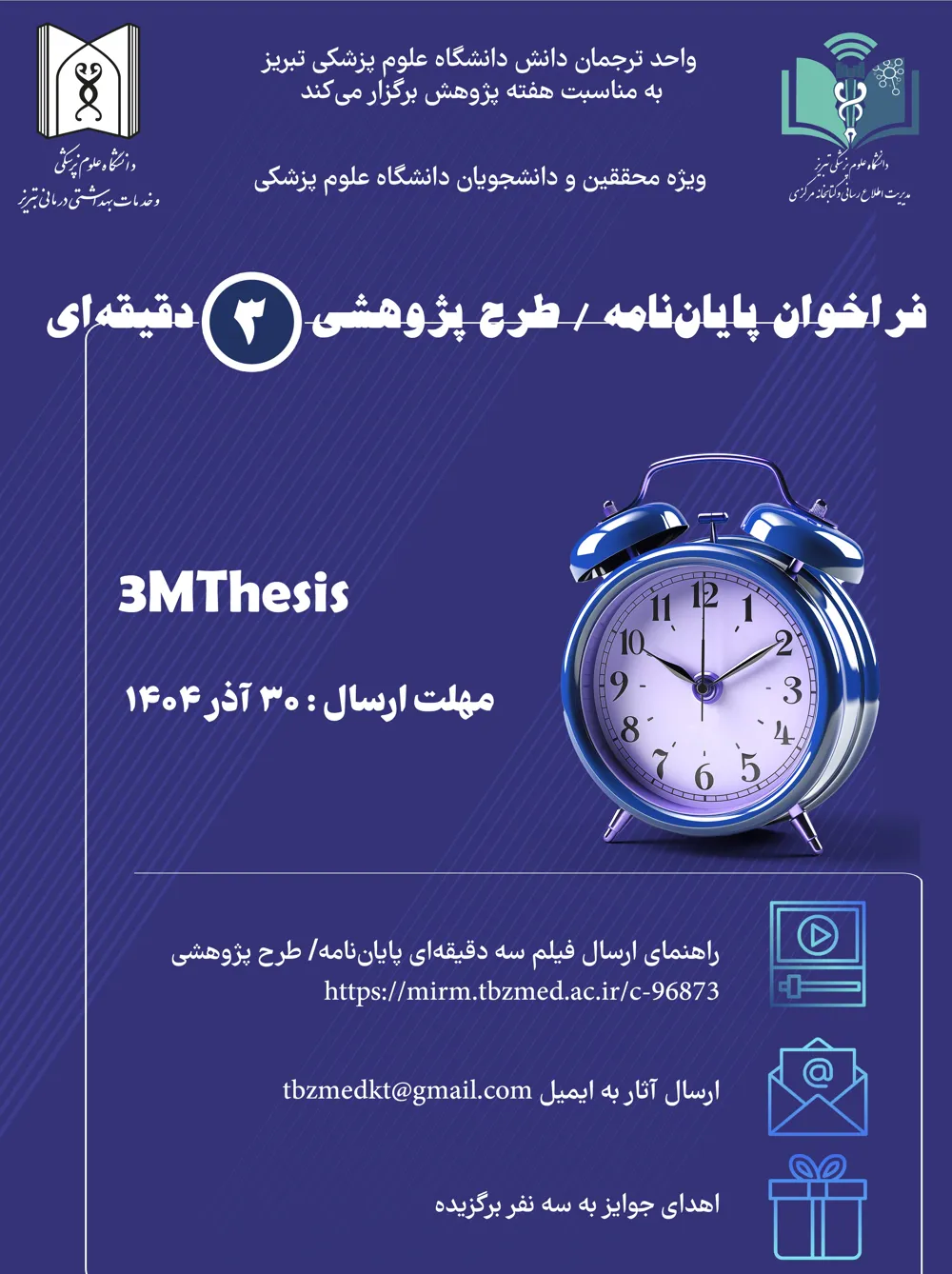 📣 فراخوان شرکت در ارائه سهدقیقه ای Three Minute Research Projects or Thesis (3MT) (برای مشاهده پوستر فراخوان کلیک نمایید)