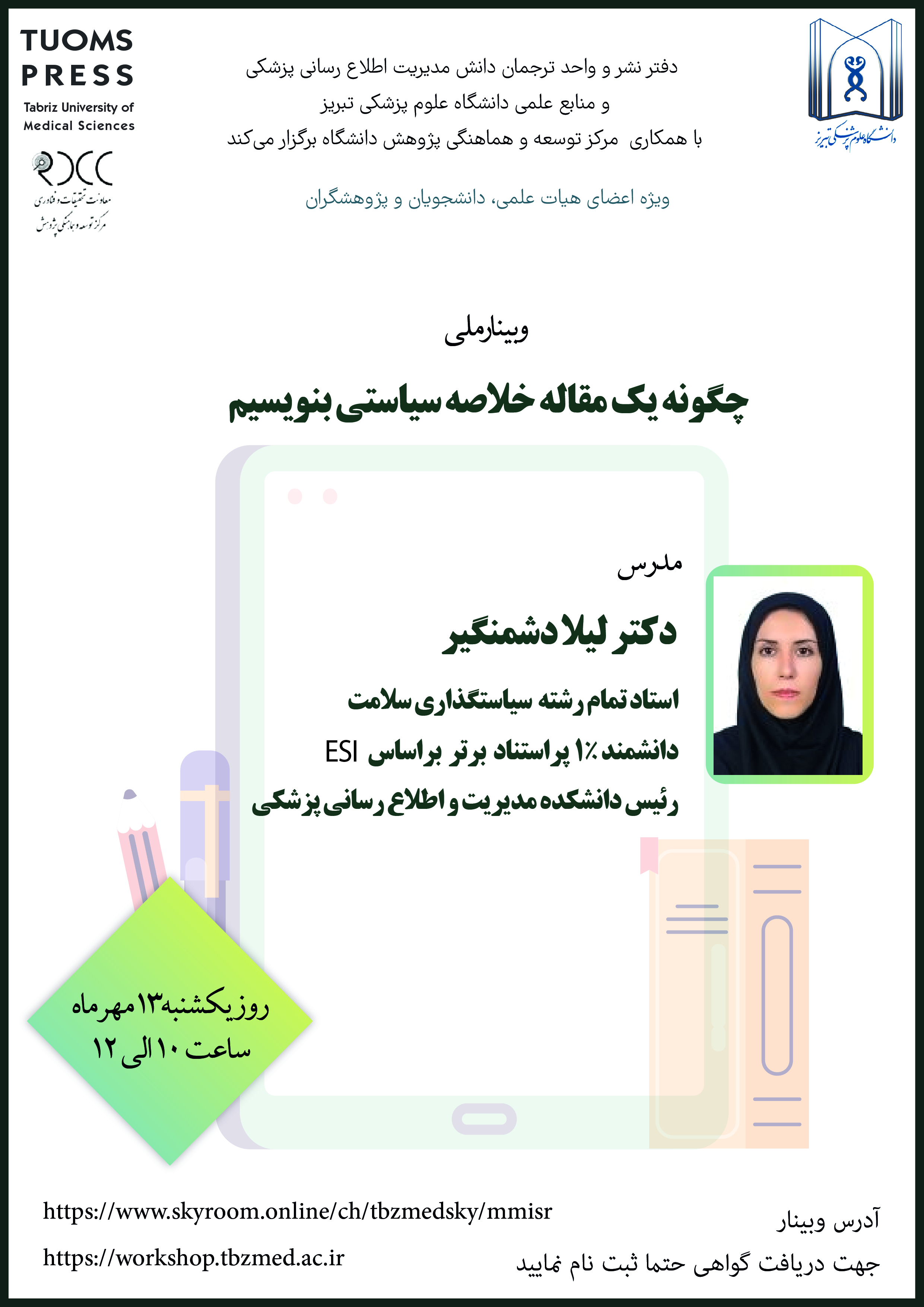 مدیریت اطلاع رسانی پزشکی منابع علمی دانشگاه علوم پزشکی تبریز با همکاری مرکز توسعه و هماهنگی کشور دانشگاه علوم پزشکی تبریز ، وبینار ملی "چگونه یک مقاله خلاصه سیاستی بنویسیم" را روز یکشنبه 13 مهر ماه سالجاری در بستر اسکای روم برگزار می کند