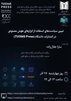 به گزارش روابط عمومی معاونت تحقیقات و فناوری ، گروه نشریات و کتب مدیریت اطلاع رسانی پزشکی و منابع علمی با همکاری مرکز توسعه و هماهنگی پژوهش، وبینار " تبیین سیاستهای استفاده از ابزارهای هوش مصنوعی در انتشارات دانشگاه (TUOMS Press) " را روز چهارشنبه 26 آذرماه 1404 از ساعت 13 الی 14 به صورت مجازی در بستر اسکای روم با ارائه خانم سارا جلال زاده سرگروه نشر و کارشناس ارتقا و نمایه سازی مدیریت اطلاع رسانی پزشکی برگزار می کند.