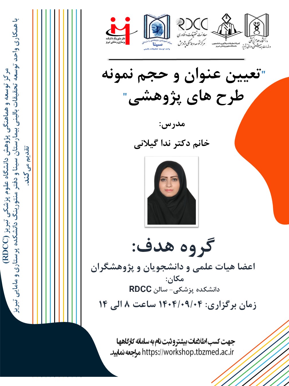 واحد توسعه تحقیقات بالینی بیمارستان سینا در نظر دارد کارگاه هایی با عناوین"تعیین حجم نمونه طرح های پژوهشی"،"آموزش نرم افزار مندلی"، "بیوبانک ها و پژوهشهای میان رشته ای: چالش ها، راهکارها و چشم اندازها"،"ایده تا ثبت اختراع"و" نگارش پروپوزال و اجرای طرح های کارآزمایی بالینی" را در سال 1404 برگزار نماید.