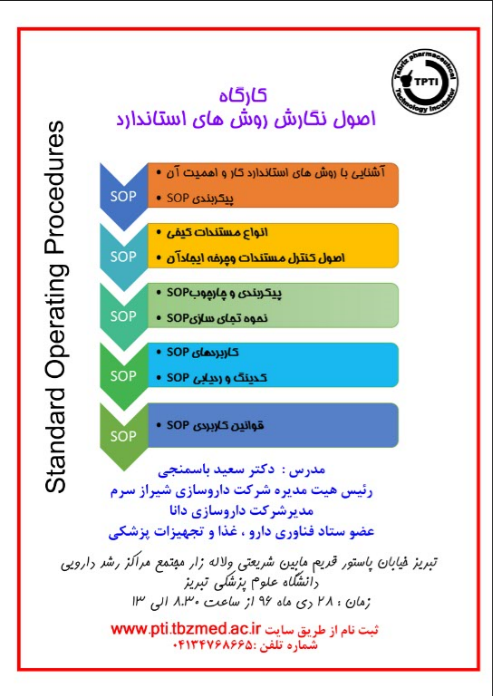کارگاه SOP با هماهنگی با مدیر محترم کارخانه داروسازی دانا جناب آقای دکتر باسمنجی متخصص داروسازی صنعتی برگزار شد کارگاه در روز پنج شنبه 28 دی 96 در سالن همایشهای مرکز رشد دارویی از ساعت 8.30 الی 13.30 به صورت کارگاه آموزشی به همراه ورک شاپ( عملی) برگزار گردید.