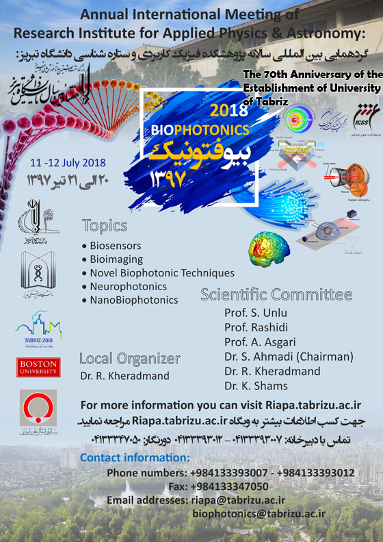 پژوهشکده فیزیک کاربردی درنظر دارد در راستای برگزاری گردهمایی های بین المللی سالانه که در پژوهشکده برگزار میشود، امسال اولین گردهمایی بین المللی با موضوع بیوفوتونیک را در سطح بین المللی و با تاکید بر اهمیت علم بیوفوتونیک، کاربردها و تازه های بیوفوتونیک در تاریخ 20 الی 21 تیرماه برگزار نماید.