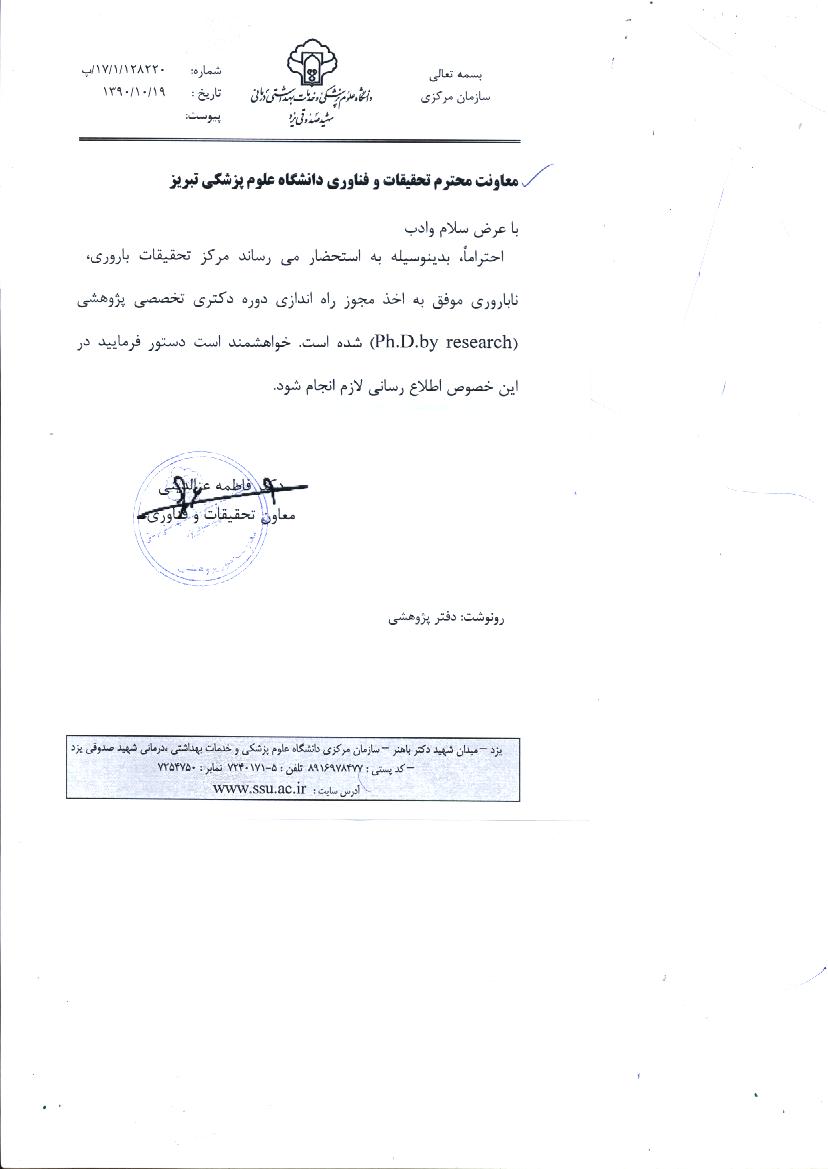 «پذيرش دانشجوي PhD By Research در مركز تحقيقات باروري و ناباروري دانشگاه علوم پزشكي شهيد صدوقي يزد»