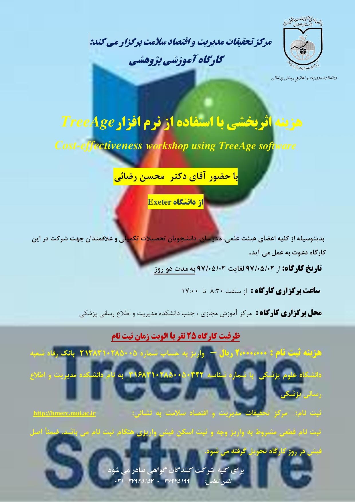 مرکز تحقیقات مدیریت و اقتصاد سلامت با همکاری دانشکده مدیریت و اطلاع رسانی پزشکی در راستای تحقق اهداف خود کارگاه آموزشی پژوهشی هزینه اثر بخشی با استفاده از نرم افزار TreeAge را در تاریخ ۲ و ۳ مرداد ماه ۱۳۹۷ طراحی و اجرا می نماید.مدرس این کارگاه آقای دکتر محسن رضائی از دانشگاه Exeter و به زبان فارسی تدریس می نمایند.کلیه اعضاء هیآت علمی،مدرسان ،دانشجویان تحصیلات تکمیلی و سایر علاقمندان می توانند در این کارگاه آموزشی ثبت نام و حضور یابند.