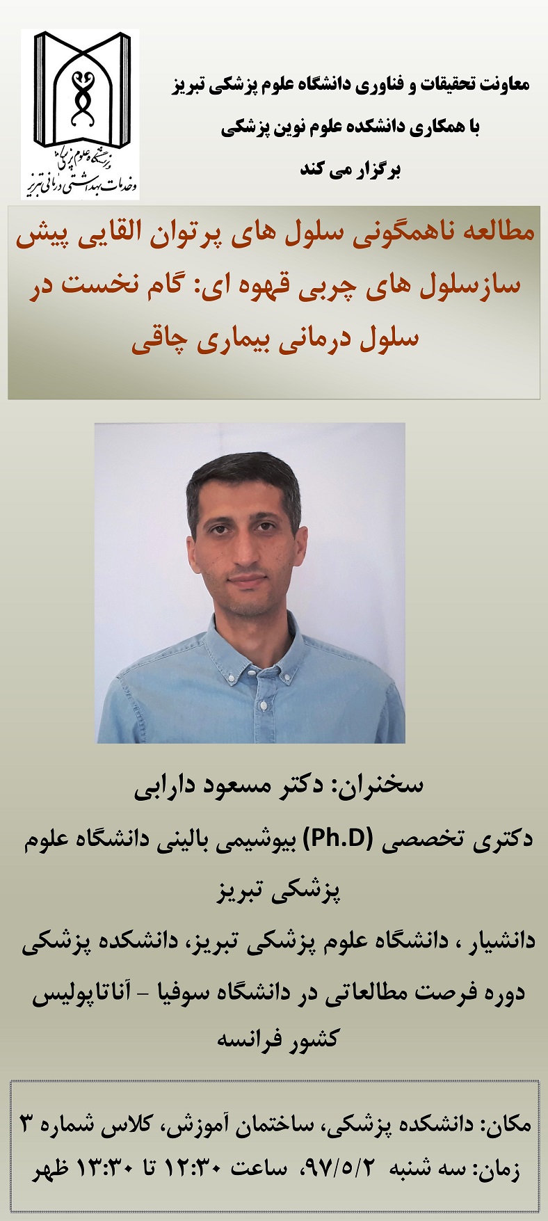 مکان: دانشکده پزشکی، ساختمان آموزش، کلاس شماره 3 زمان: سه شنبه 97/5/2، ساعت 12:30 تا 13:30 ظهر