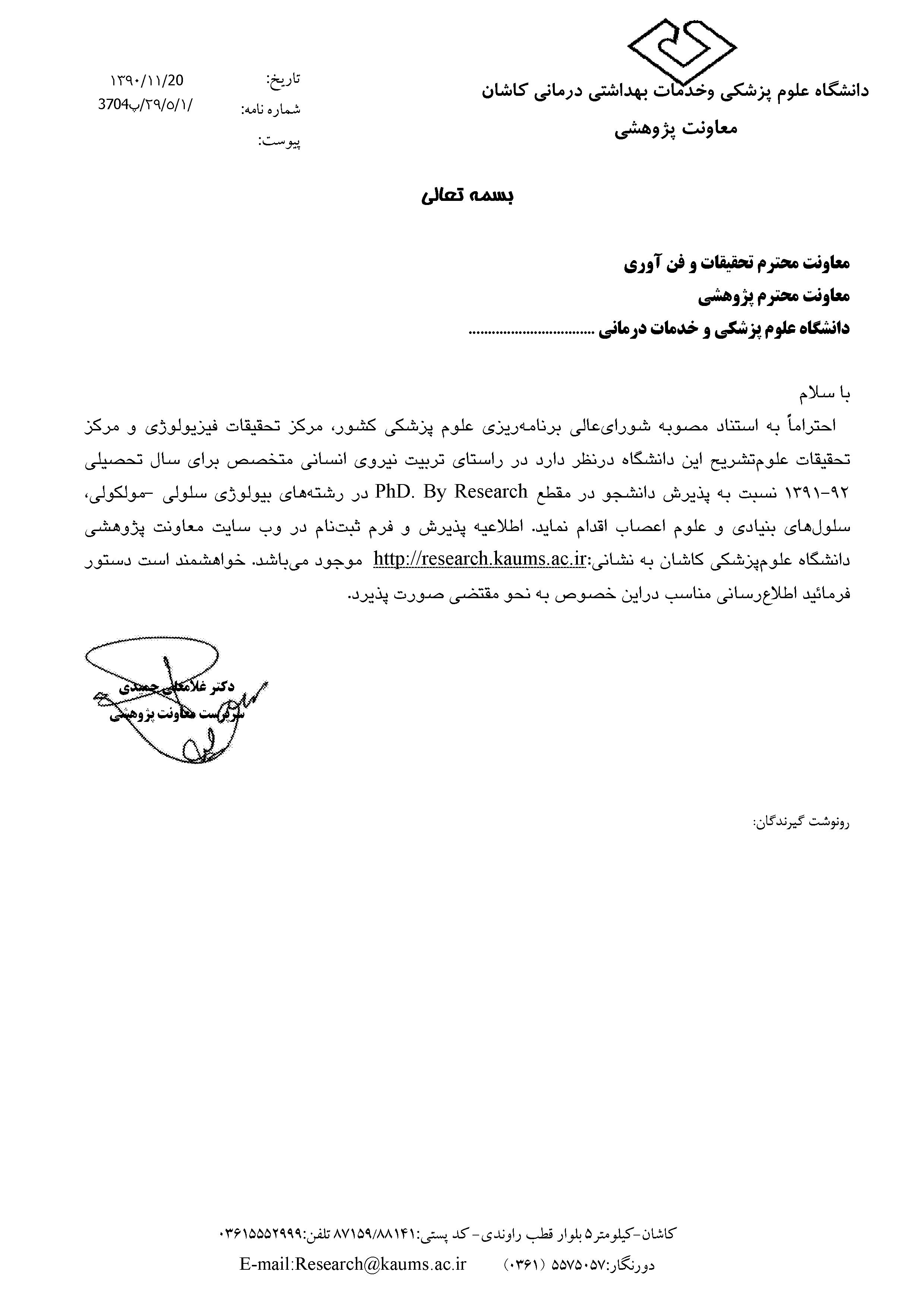 مرکز تحقیقات فیزیولوژی و مرکز تحقیقات علوم تشریح دانشگاه علوم پزشکی کاشان دانشجو می پذیرد.