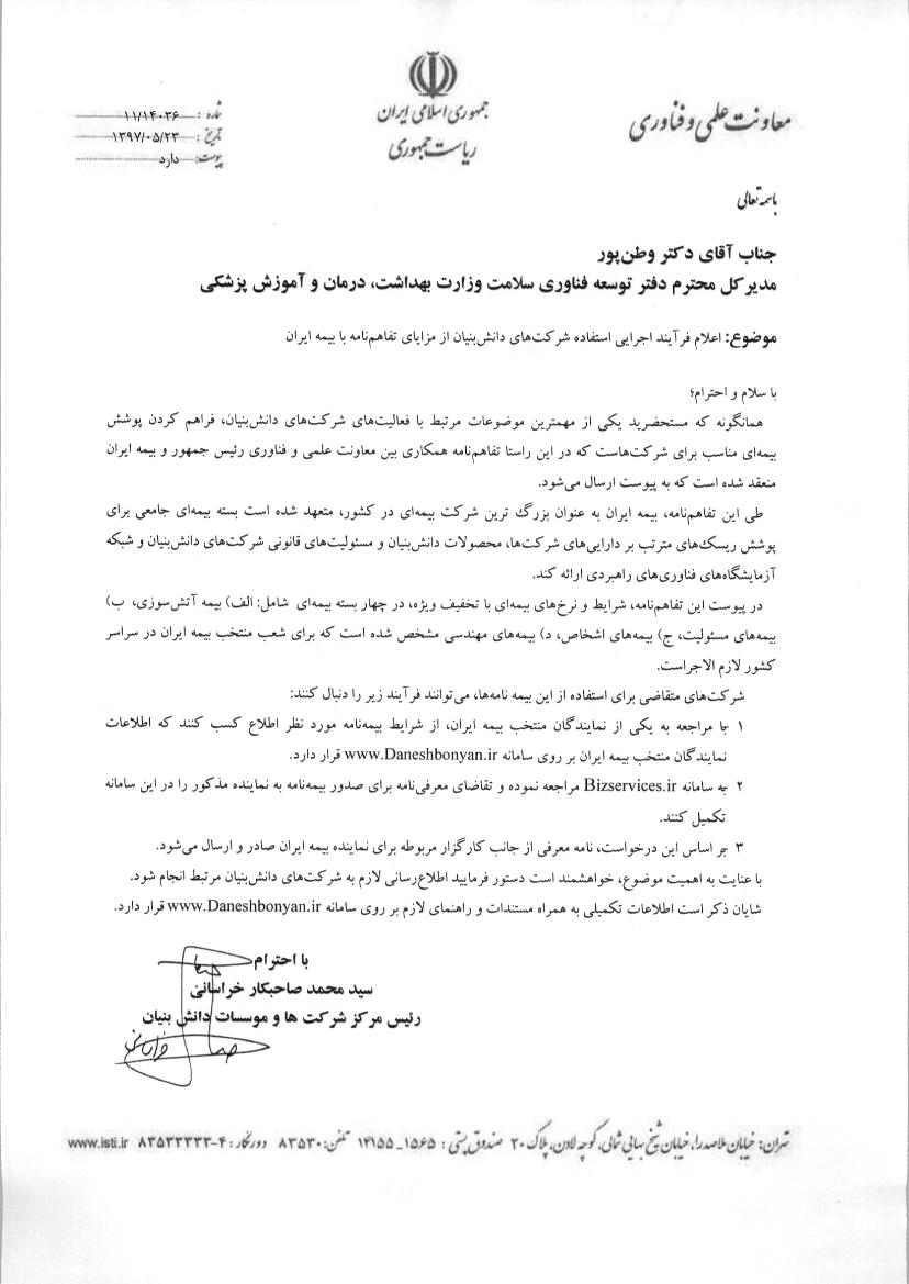 از آن جا که یکی از مهمترین موضوعات مرتبط با فعالیتهای شرکتهای دانشبنیان، فراهم کردن پوشش بیمهای مناسب برای شرکتهاست، تفاهمنامه همکاری بین معاونت علمی و فناوری رئیس جمهور و بیمه ایران در این زمینه منعقد شده است.
