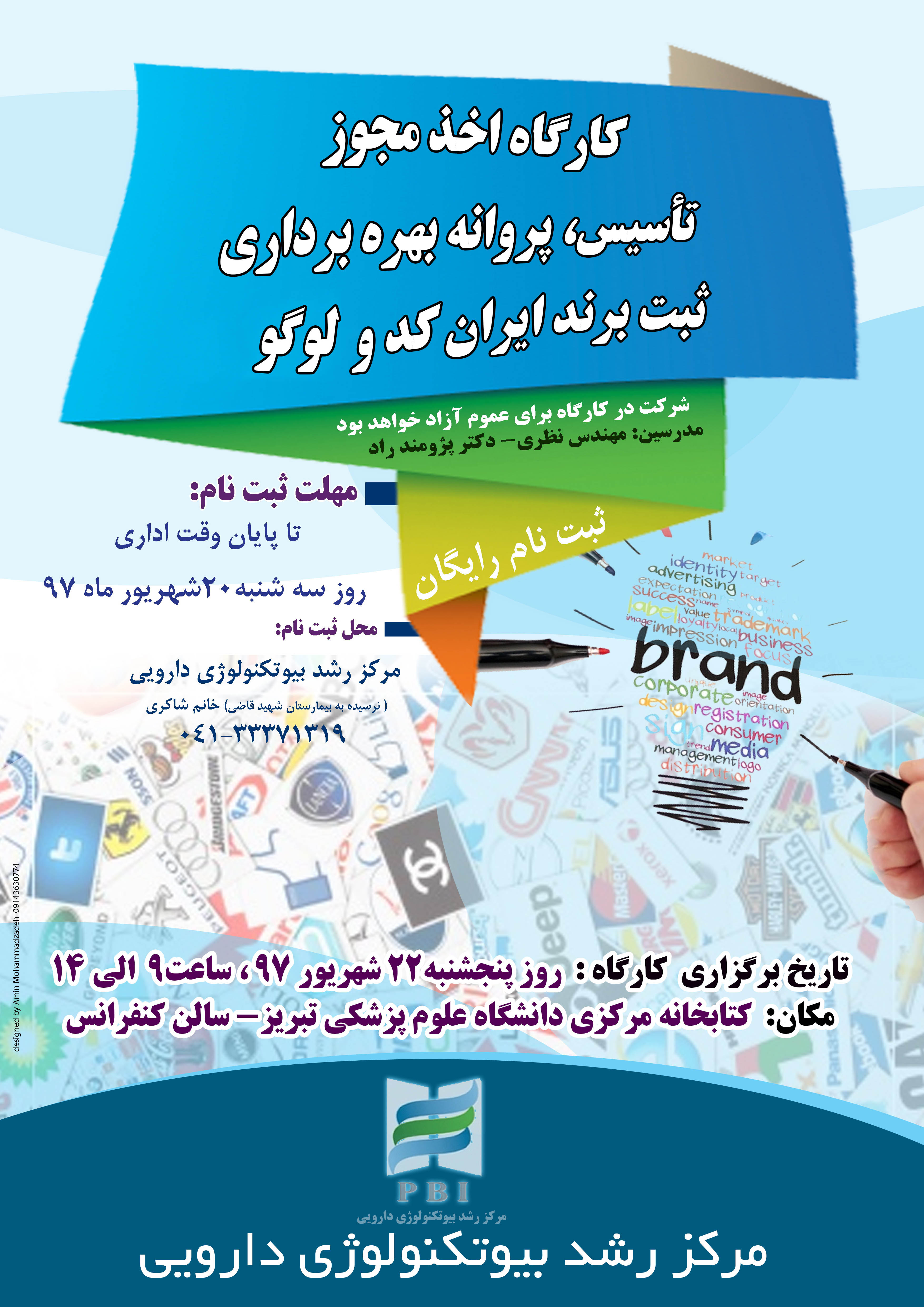 کارگاه اخذ مجوزتاسیس، پروانه بهره برداری ثبت برند ایران کد و لوگو که در تاریخ 22 شهریور ماه 97 توسط مرکز رشد بیوتکنولوژی دارویی در محل سالن کنفرانس کتابخانه مرکزی دانشگاه علوم پزشکی تبریز برگزار خواهد شد .