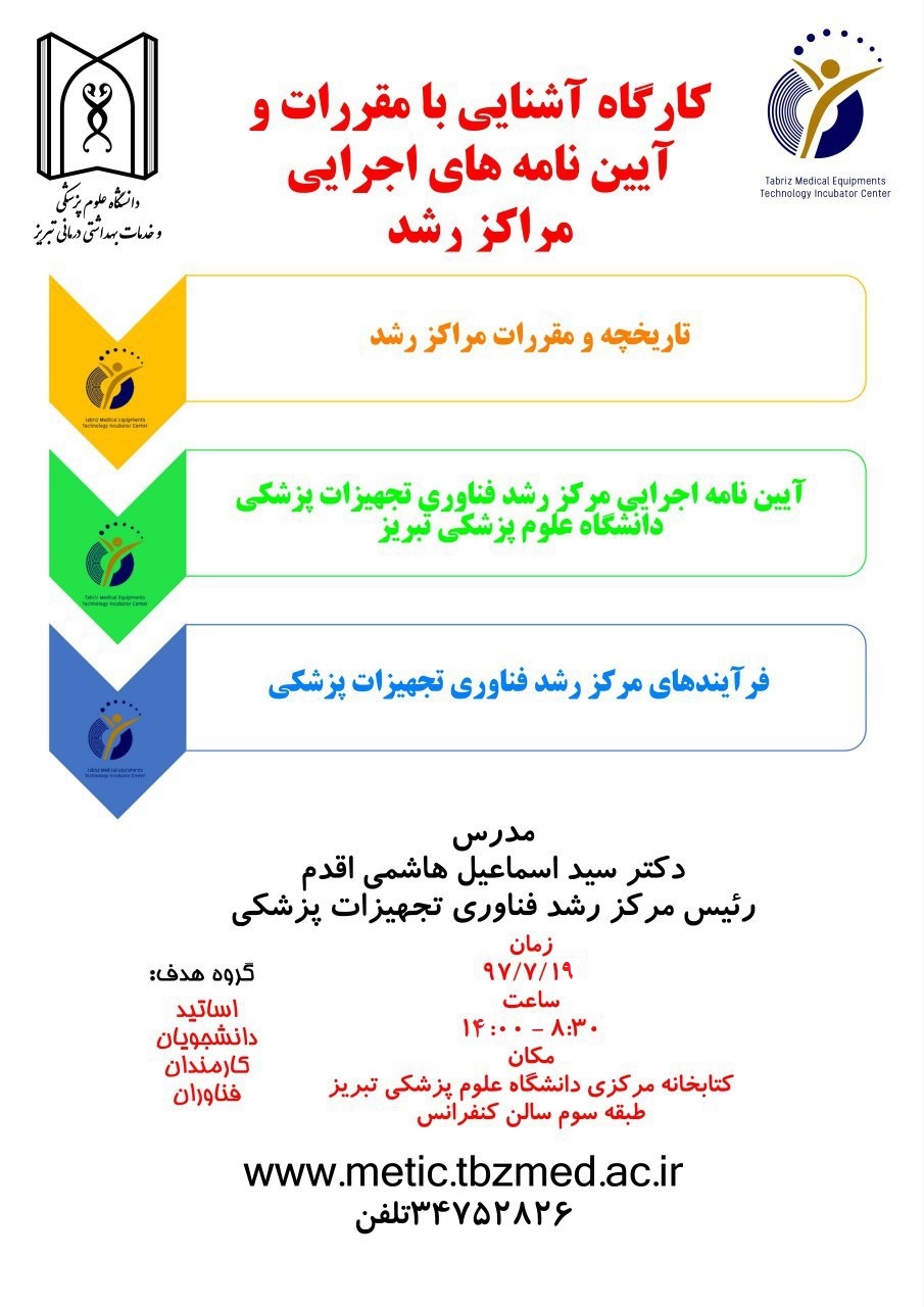 با عنایت به اهمیت موضوع آشنایی با مقررات حوزه فناوری، آیین نامه های اجرایی و اساسنامه مراکز رشد به استحضار می رساند مرکز رشد تجهیزات پزشکی دانشگاه در نظر دارد کارگاهی تحت عنوان "آشنایی با مقررات و آیین نامه اجرایی مراکز رشد" برگزار نماید. لذا از علاقه مندان دعوت می شود جهت حضور در کارگاه از طریق سایت http://metic.tbzmed.ac.ir ثبت نام نموده و در صورت نیاز با شماره تلفن 34752826 و شماره فکس 34752573 تماس حاصل نمایند.