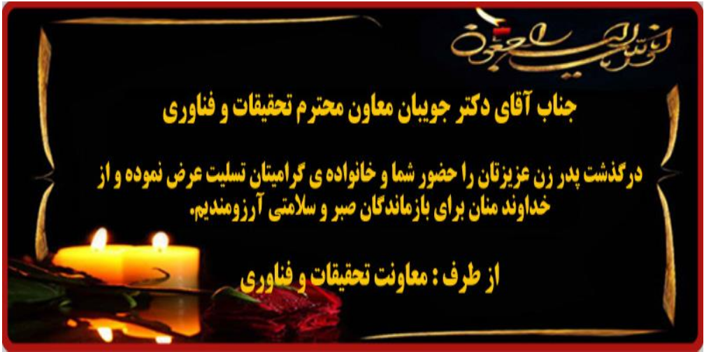تسلیت درگذشت پدرزن گرامی آقای دکتر جویبان معاون محترم تحقیقات و فناوری - کد خبر : 35720 کپی کلمات کلیدی : معاونت تحقيقات و فناوري، تسلیت دکتر جویبان درگذشت پدرزن