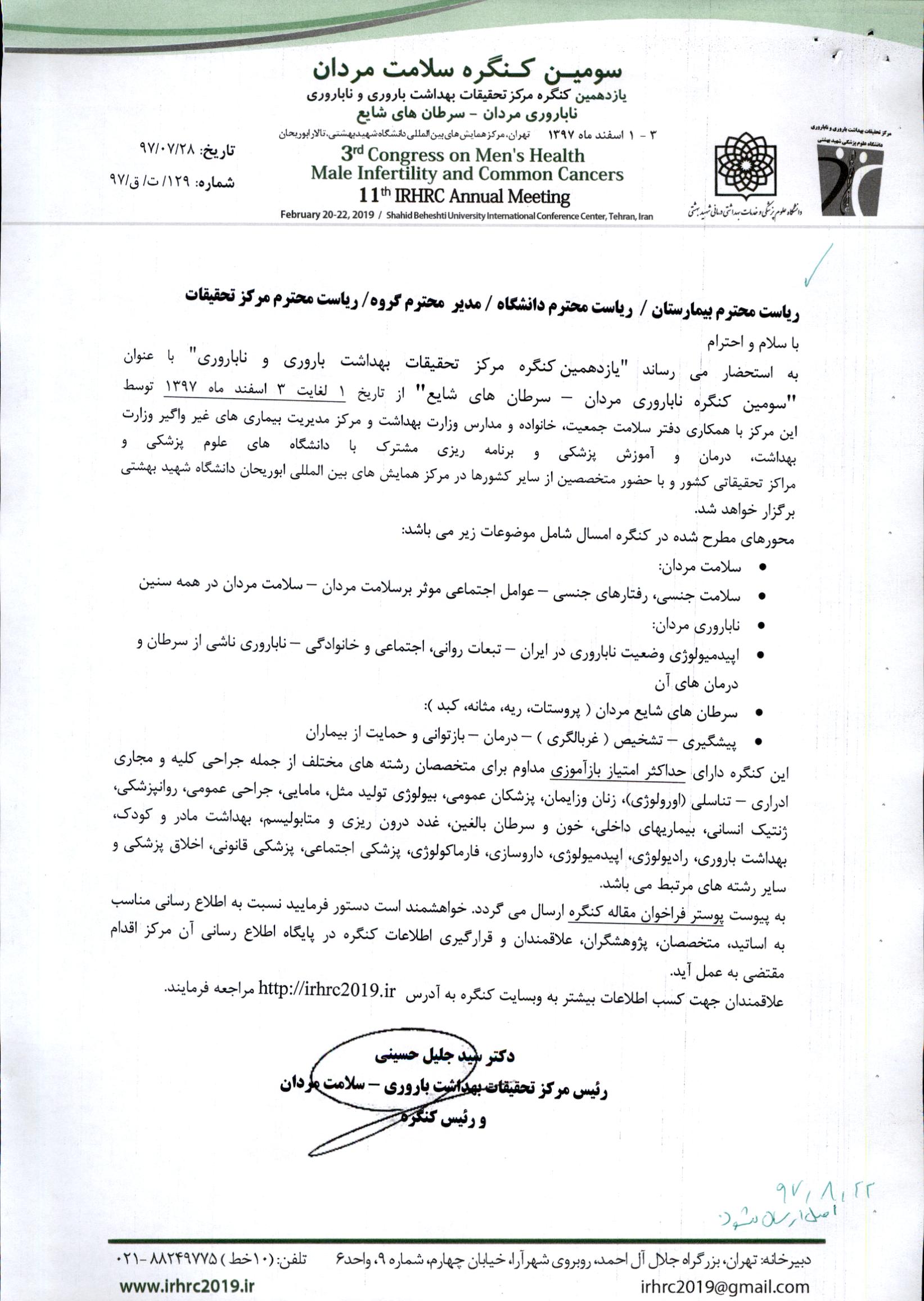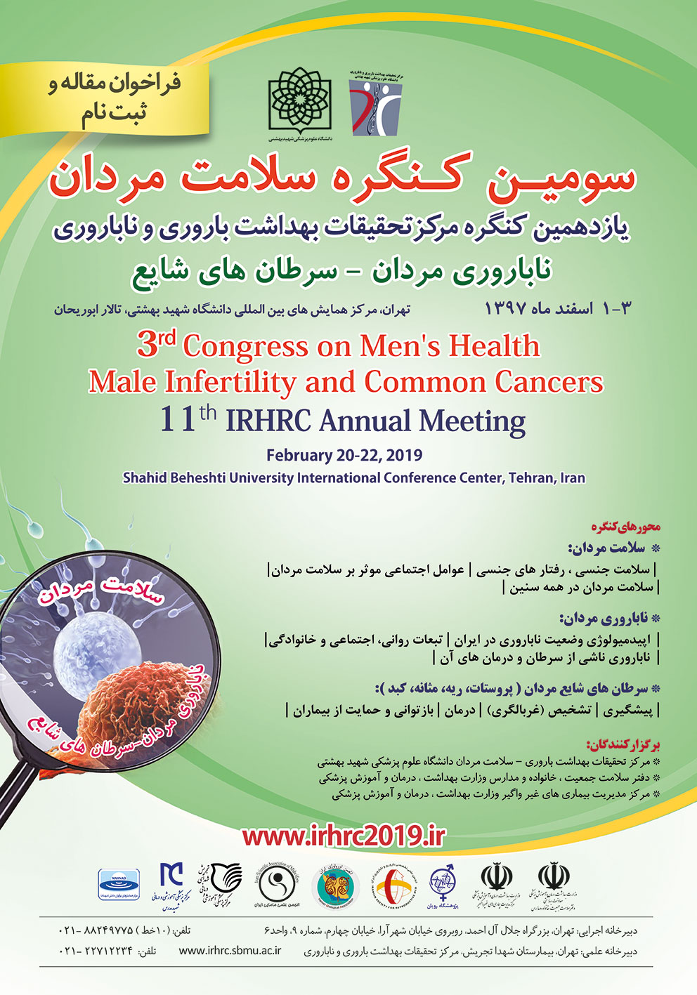 یازدهمین کنگره مرکز تحقیقات بهداشت باروری و ناباروری و سومین کنگره سلامت مردان، ناباروری و سرطان های شایع مردان توسط مرکز تحقیقات بهداشت باروری و ناباروری دانشگاه علوم پزشکی شهید بهشتی، دفتر سلامت جمعیت، خانواده و مدارس وزارت بهداشت در تاریخ ۱-۳ اسفند ۱۳۹۷ در شهر تهران و در تالار ابوریحان برگزار میگردد.