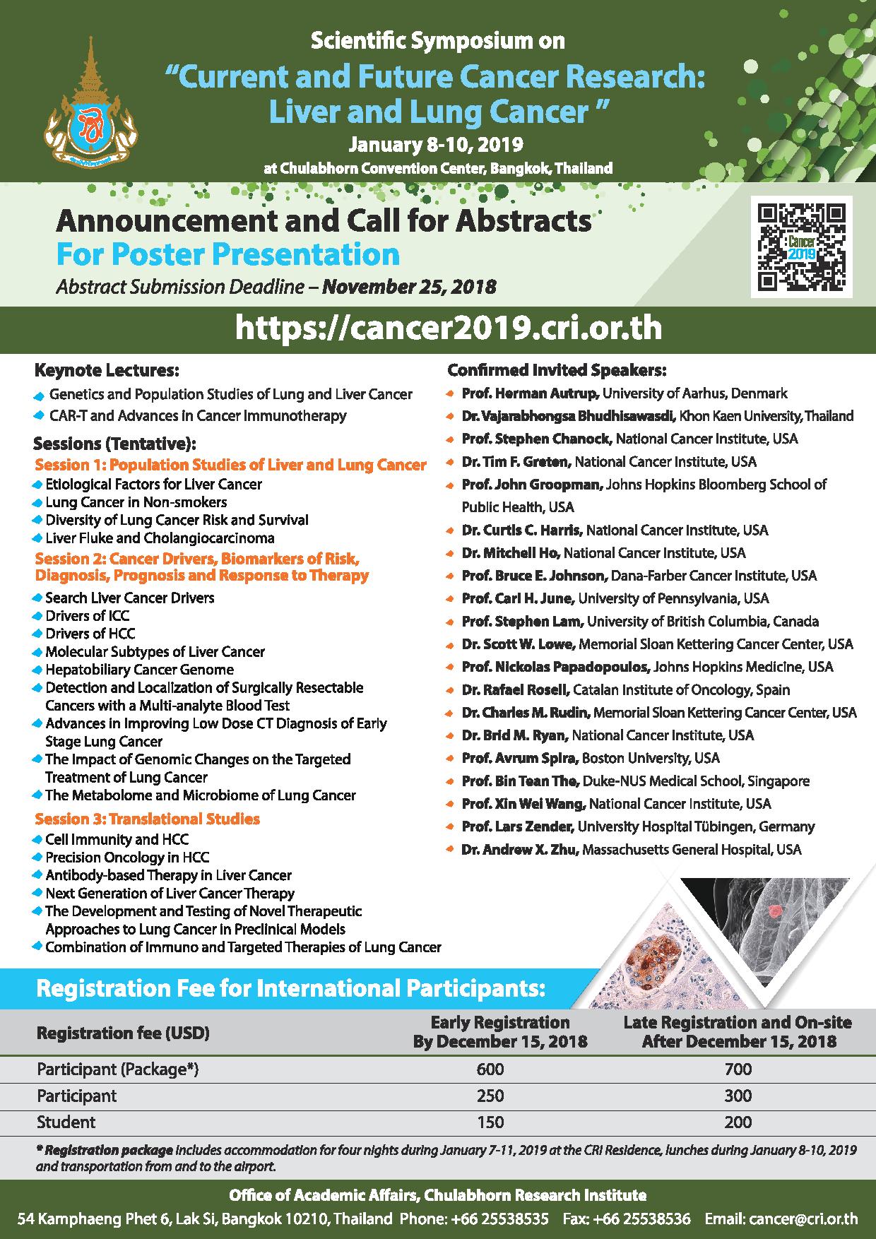 « سمپوزیوم تحقیقات کنونی و آینده در زمینه سرطان کبد و ریه » در مرکز همایش های چولابورن تایلند از تاریخ ۸ الی ۱۰ ژانویه ۲۰۱۹ برگزار می شود.