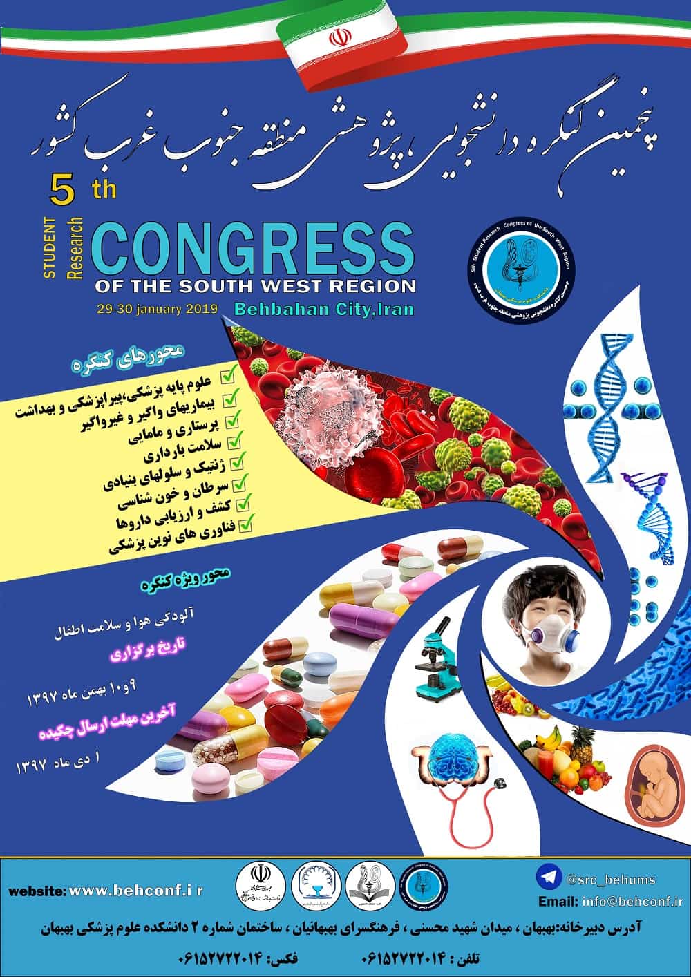 پنجمین کنگره دانشجویی و پژوهشی منطقه جنوب غرب کشورتوسط کمیته تحقیقات دانشجویی دانشکده علوم پزشکی بهبهان در تاریخ ۹-۱۰ بهمن ۱۳۹۷ برگزار میگردد.