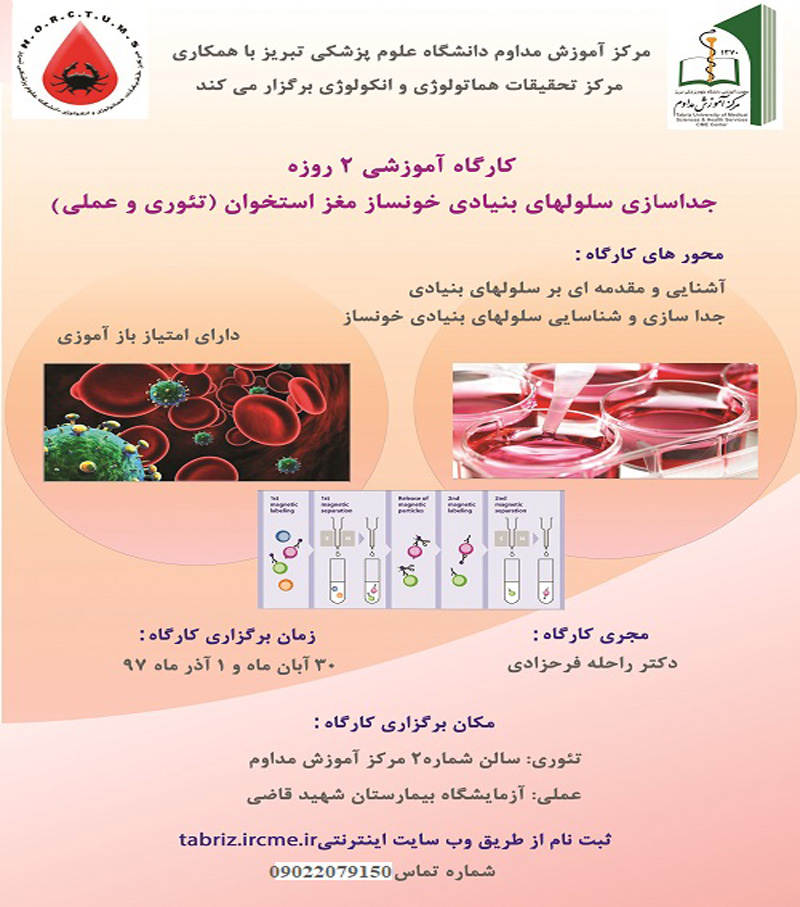 برگزاری کارگاه آموزشی دو روزه با عنوان "جداسازی سلولهای بنیادی خونساز مغز استخوان (تئوری و عملی)"
