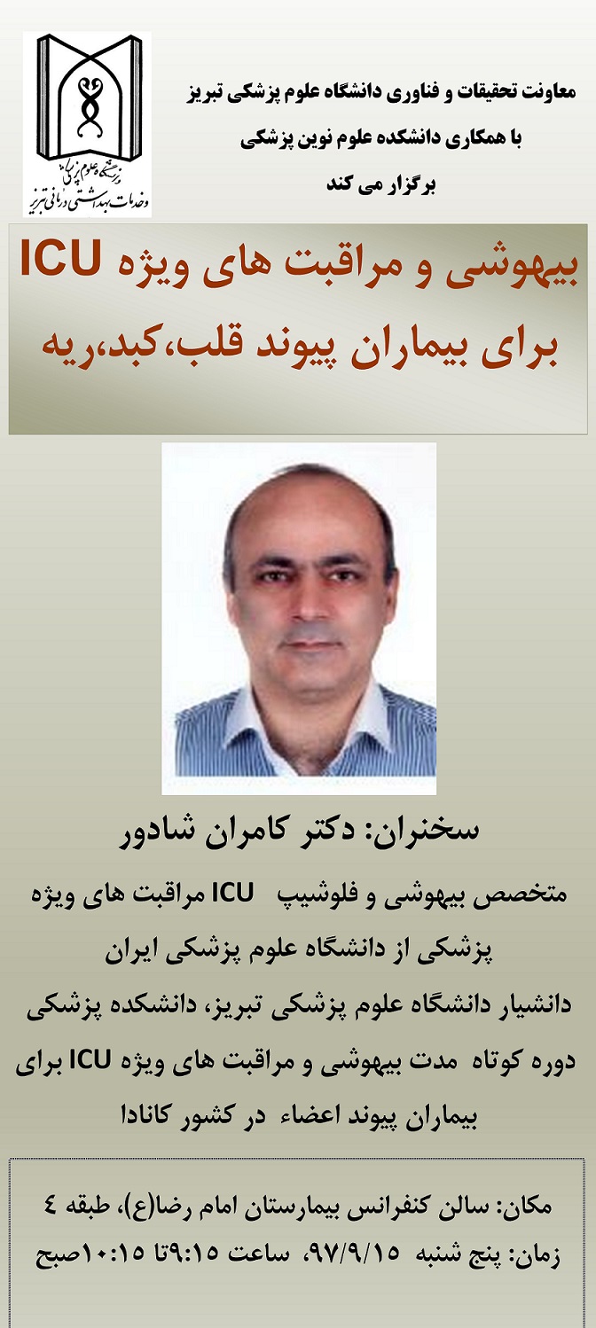 سخنرانی آقای دکتر کامران شادور : " بیهوشی و مراقبت های ویژه ICU برای بیماران پیوند قلب،کبد،ریه "