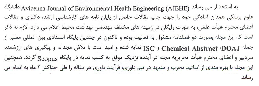 فراخوان چاپ مقاله در مجله Avicenna Journal of Environmental Health Engineering(AJEHE) دانشگاه علوم پزشکی همدان