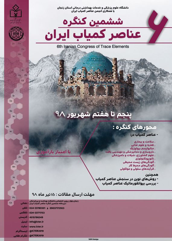 برگزار کننده: دانشگاه علوم پزشکی زنجان ، انجمن عناصر کمیاب ایران مکان برگزاري: زنجان - دانشگاه علوم پزشکی زنجان تاريخ برگزاري: 5 الی 7 شهریور 1398