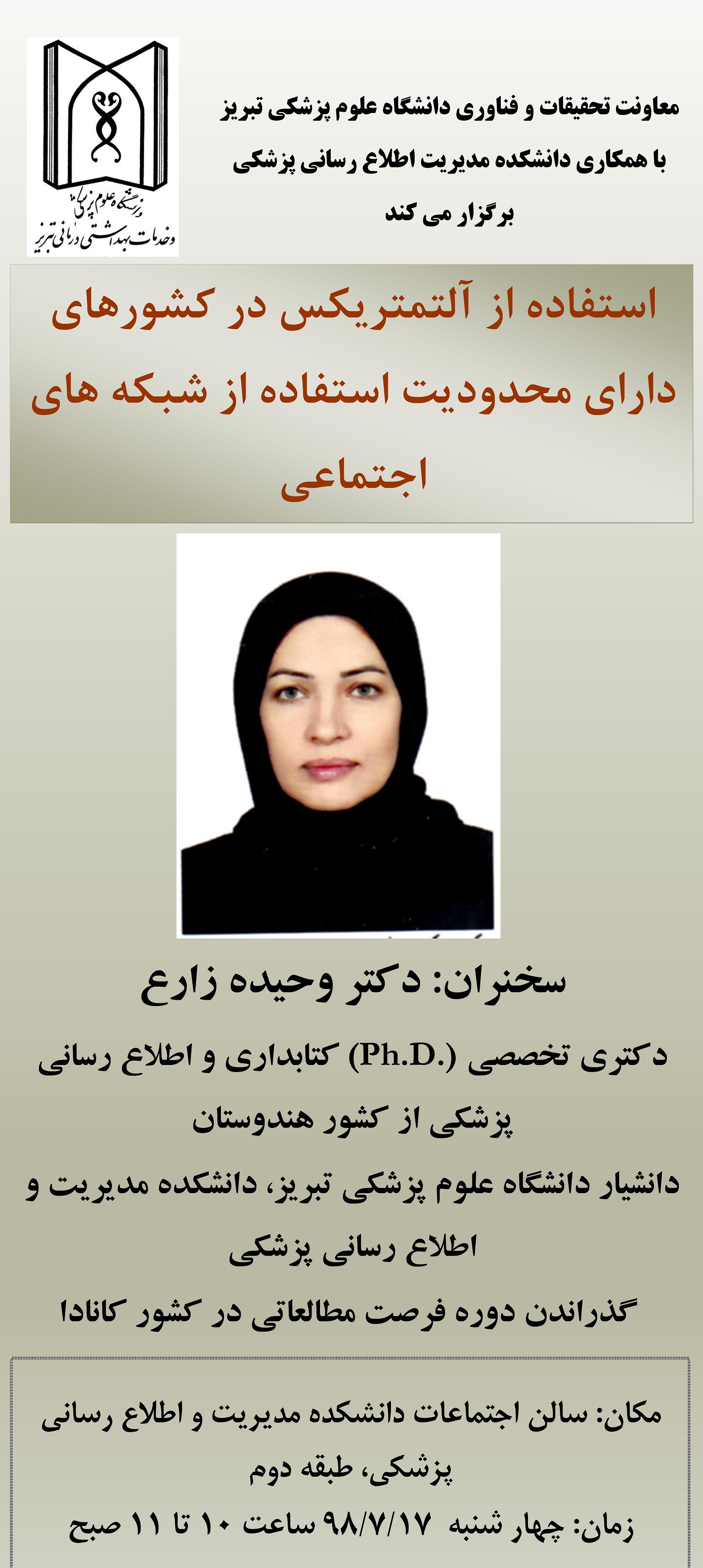 سخنرانی سرکار خانم دکتر وحیده زارع با عنوان: " استفاده از آلتمتریکس در کشورهای دارای محدودیت استفاده از شبکه های اجتماعی "