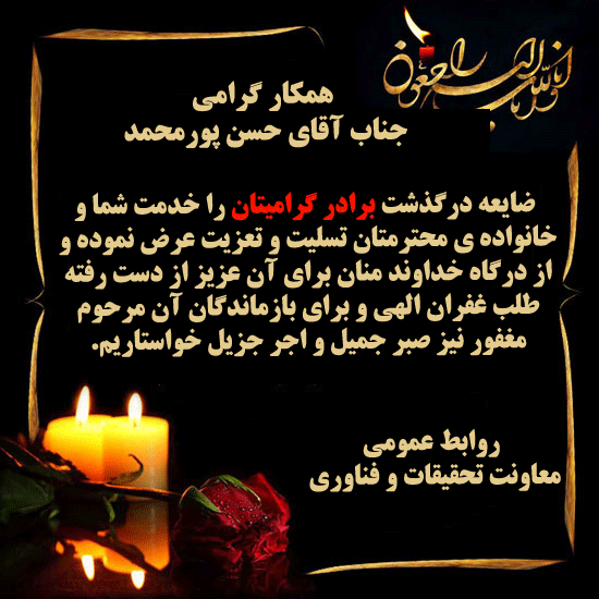 تسلیت به همکار گرامی جناب آقای حسن پورمحمد در خصوص ضایعه درگذشت برادر عزیزشان - کد خبر : 36004 کپی کلمات کلیدی : آقای حسن پورمحمد ضایعه درگذشت