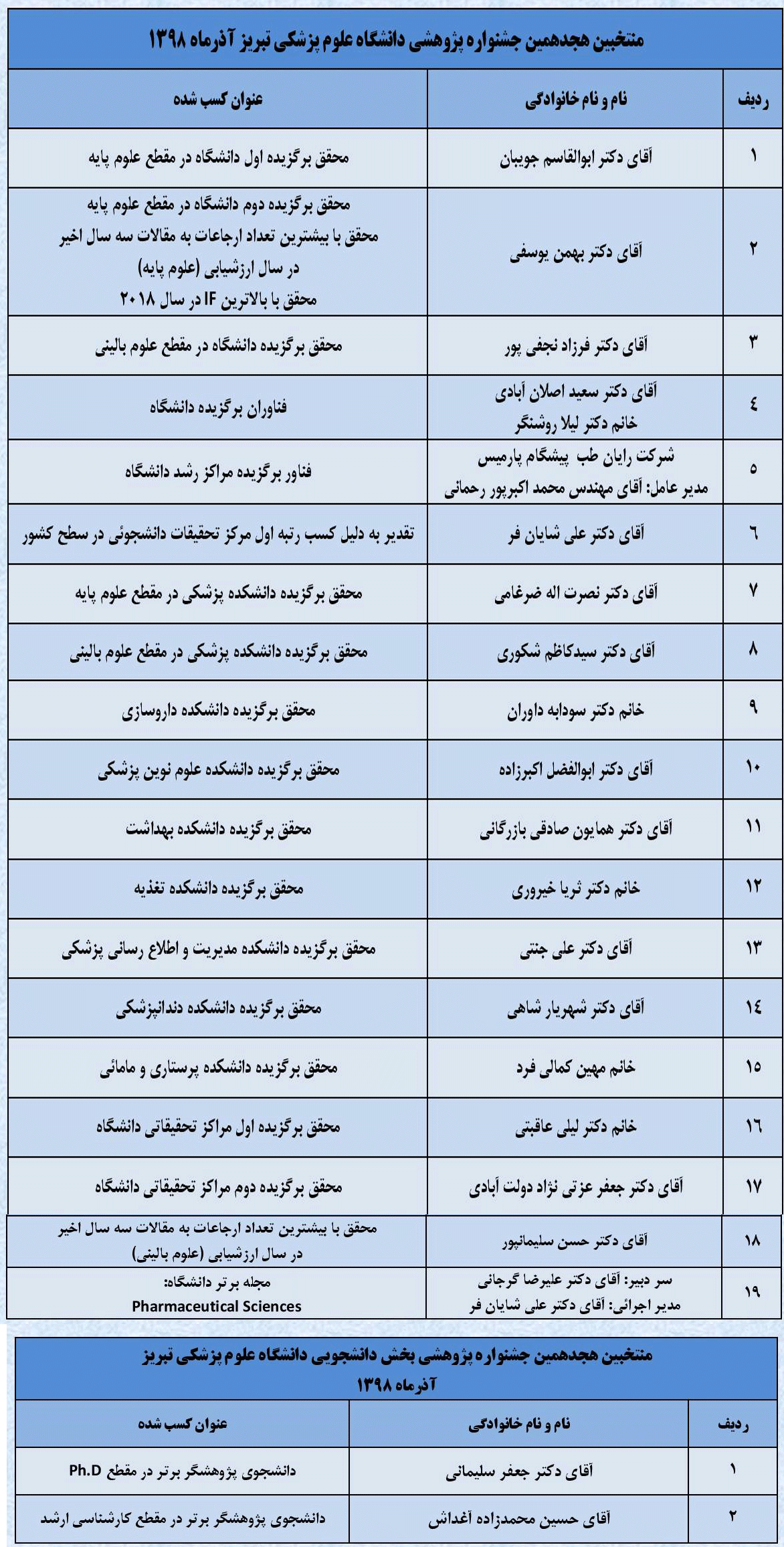 منتخبین هجدهمین جشنواره پژوهشی دانشگاه علوم پزشکی تبریز آذرماه 1398