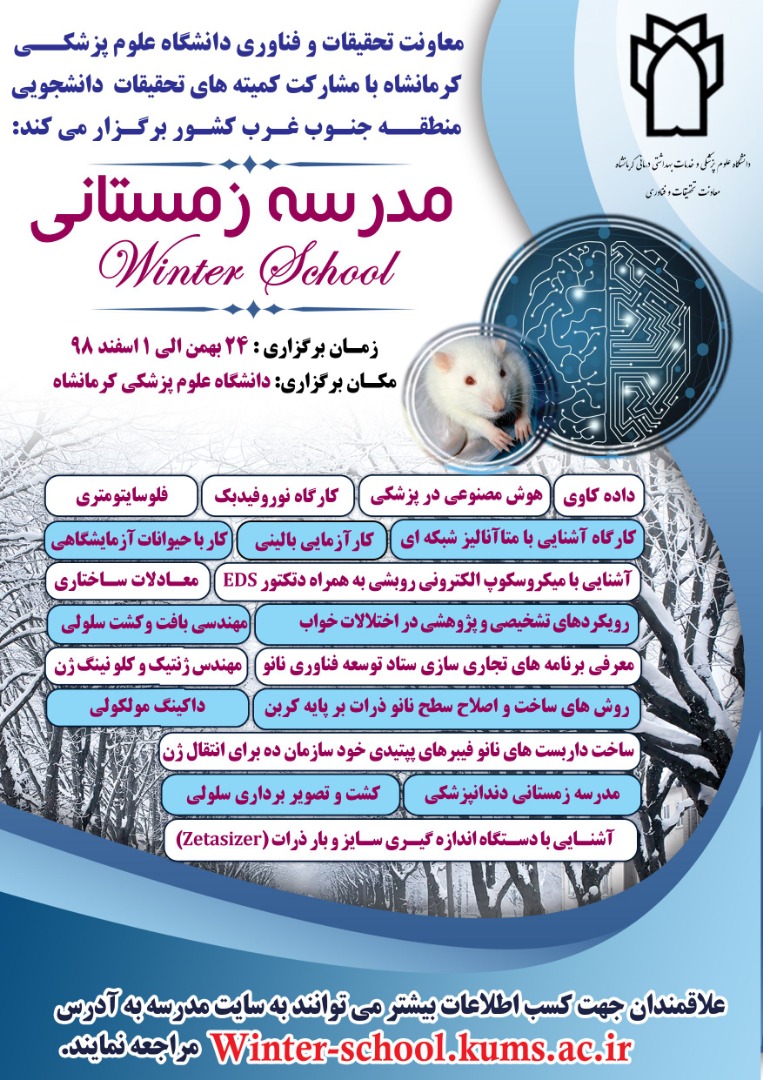 اولین دوره مدسه زمستانی معاونت تحقیقات و فناوری دانشگاه با مشارکت کمیته های تحقیقات دانشجویی منطقه جنوب غرب کشور در قالب 19 دوره آموزشی - پژوهشی از تاریخ 24 بهمن لغایت 1 اسفند ماه در دانشگاه علوم پزشکی کرمانشاه برگزار می گردد.
