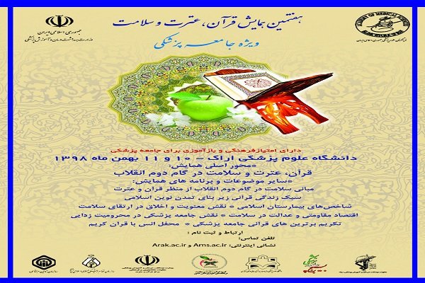 دانشگاه علوم پزشکی اراک با همکاری فرهنگستان علوم پزشکی کشور، مرکز قرآن و عترت وزارت بهداشت، درمان و آموزش پزشکی، هفتمین همایش قرآن، عترت و سلامت ویژه جامعه پزشکی در سالن شهدای دانشجو مجتمع پیامبر اعظم (ص) دانشگاه در تاریخ 10 و 11 بهمن سال 1398 برگزار می نماید.