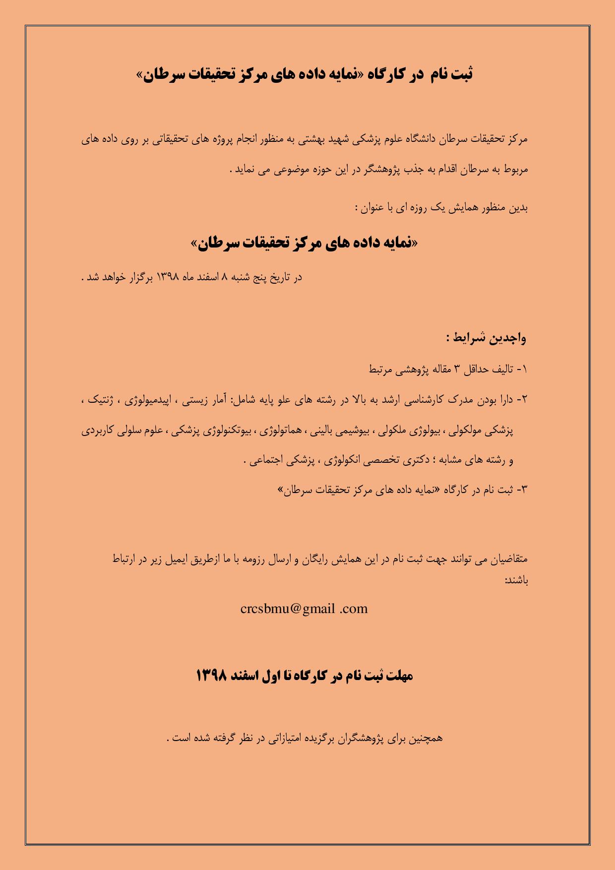کارگاه یکروزه "نمایه داده های مرکز تحقیقات سرطان" در مرکز تحقیقات سرطان دانشگاه علوم پزشکی شهید بهشتی