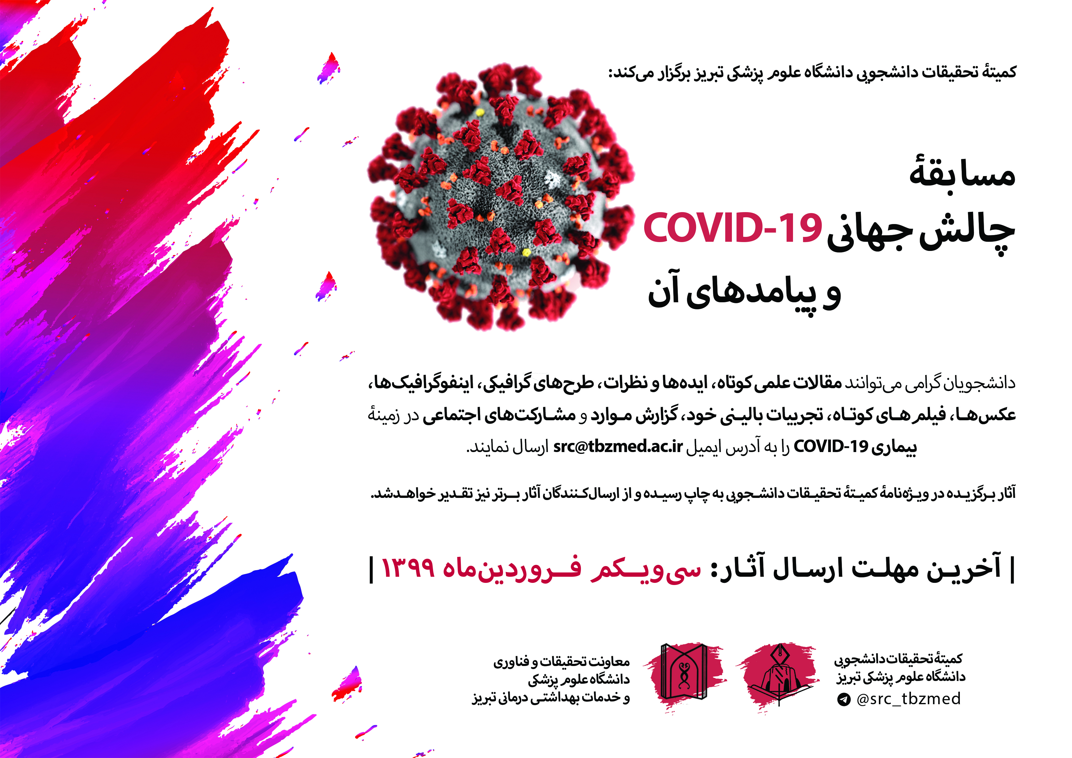 دانشجویان گرامی میتوانند آثار خود را به آدرس ایمیل src@tbzmed.ac.ir ارسال نمایند. آخرین مهلت ارسال آثار: ۳۱ فروردینماه ۱۳۹۹