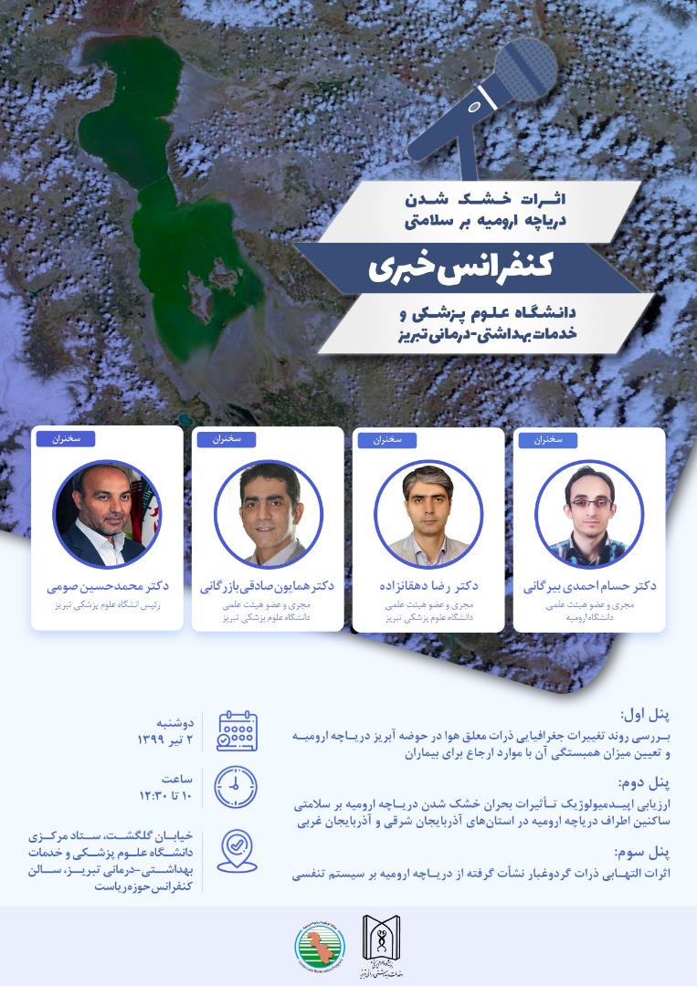 به گزارش روابط عمومی معاونت تحقیقات و فناوری دانشگاه به نقل از ستاد احیا دریاچه ارومیه، کنفرانس خبری دانشگاه علوم پزشکی و خدمات بهداشتی-درمانی تبریز در مورد اثرات سلامتی خشک شدن دریاچه ارومیه روز دوشنبه دوم تیرماه ۱۳۹۹ از ساعت ۱۰ صبح باحضور میهمانانی از اداره حفاظت محیط زیست استان، شرکت آب و فاضلاب استان، اداره کل آموزش و پرورش استان، سازمان جهاد کشاورزی استان، اعضای شورای استانی فرهنگی- اجتماعی ستاد احیای دریاچه ارومیه، دبیر سابق ستاد احیای دریاچه ارومیه استان آذربایجان شرقی و با سخنرانی دکتر صومی، رییس دانشگاه علوم پزشکی تبریز و با شرکت میهمانانی از استان آذربایجان غربی و دانشگاه ارومیه، در سالن اجتماعات حوزه ریاست دانشگاه علوم پزشکی تبریز برگزار گردید
