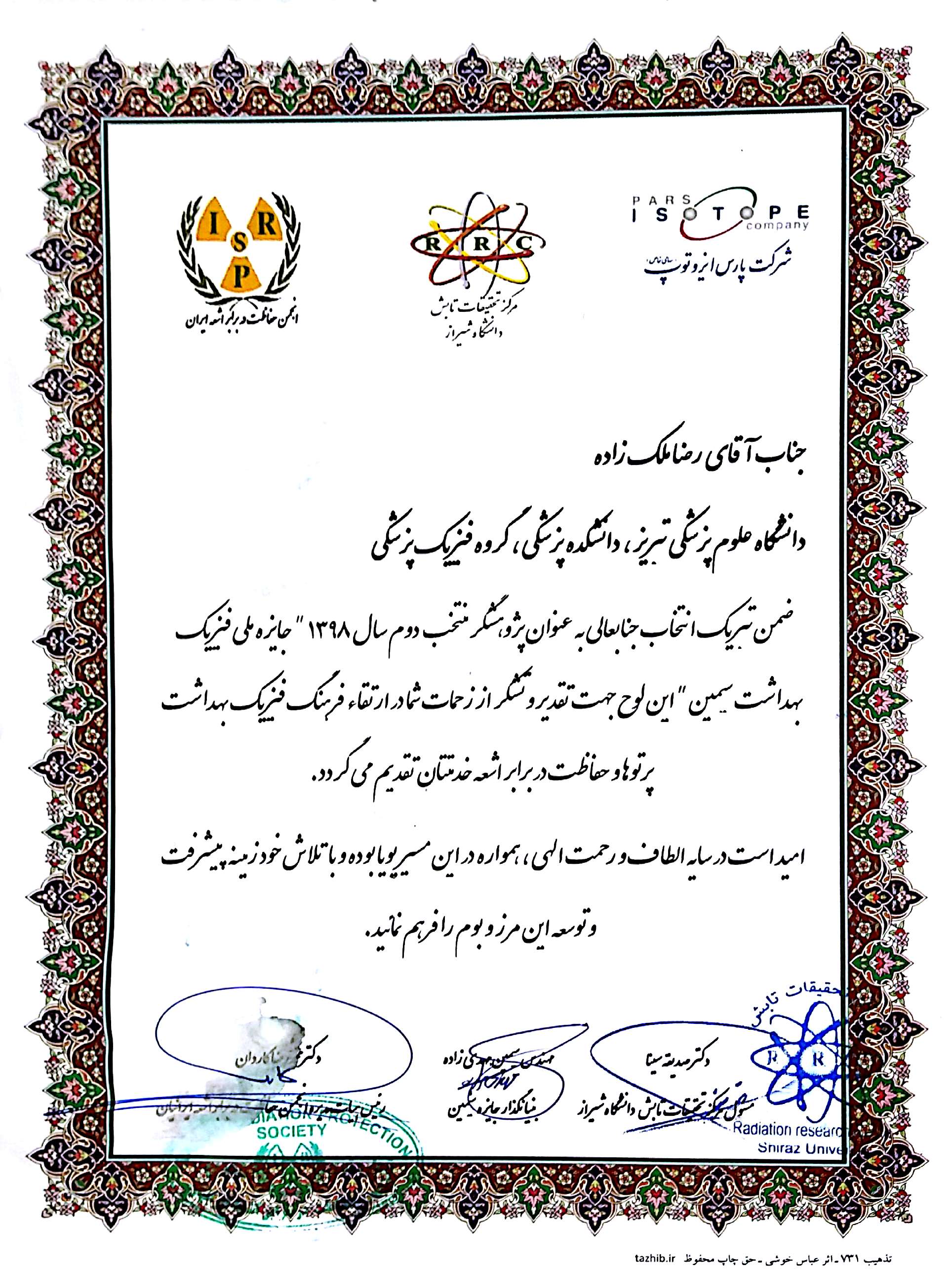 کسب رتبه ی دوم توسط آقای رضا ملک زاده دانشجوی دانشکده پزشکی تبریز در پنجمین دوره ملی جایزه فیزیک بهداشت سیمین سال 1399