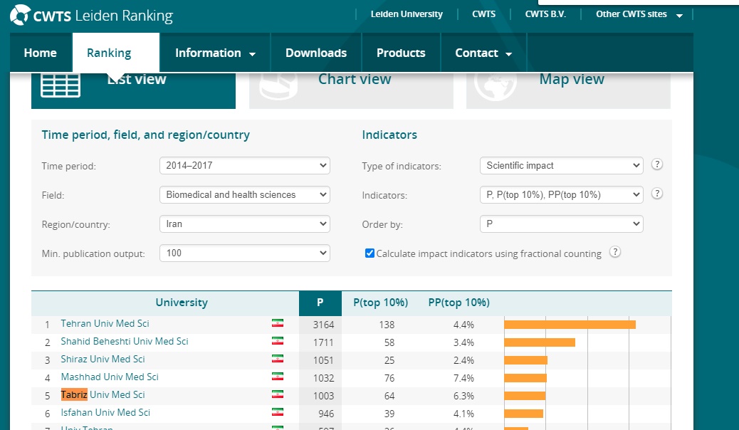 ارتقاء رتبه دانشگاه علوم پزشکی تبریز در زمینه علوم پزشکی و سلامت در رتبه بندی لایدن