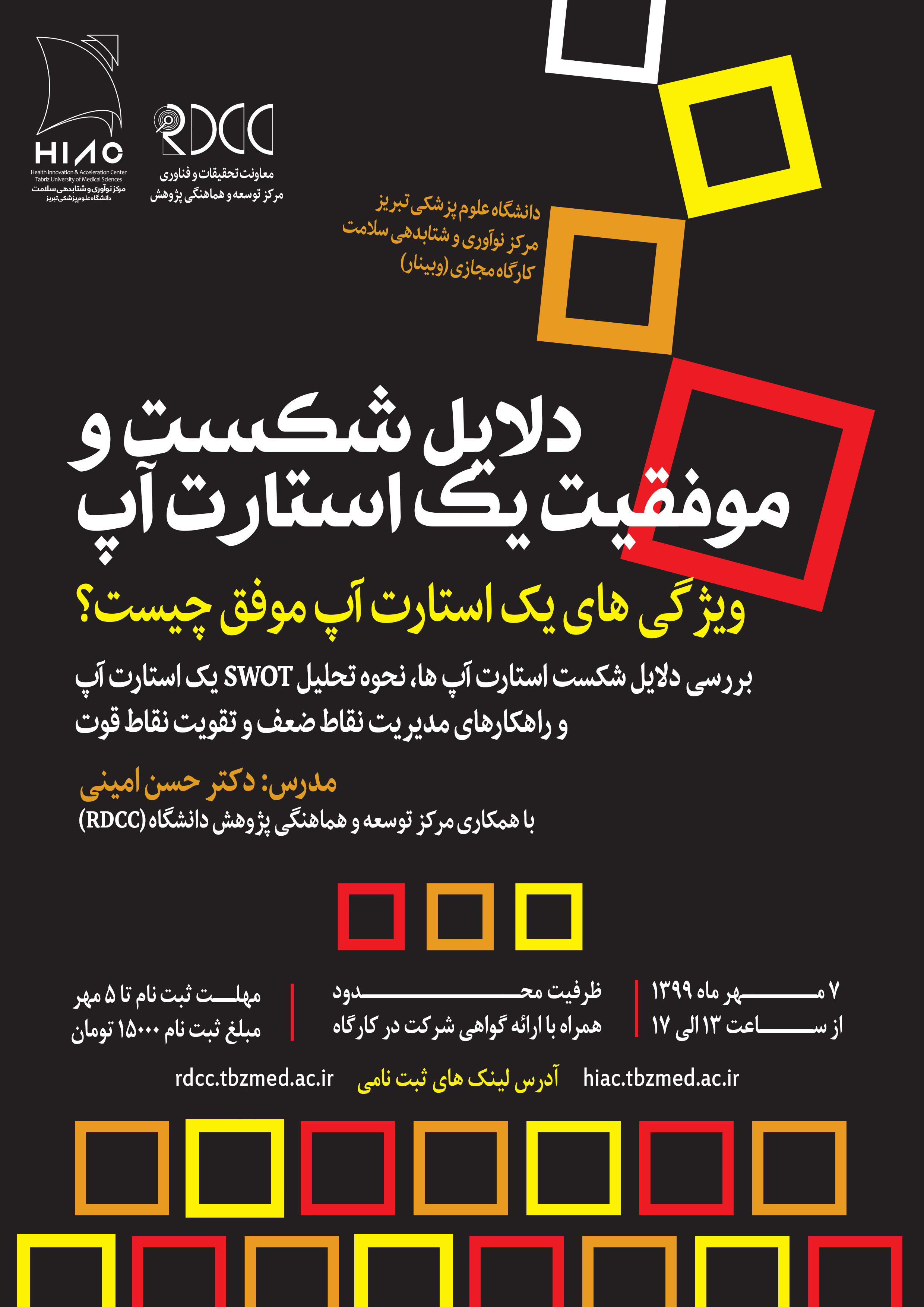 کارگاه مجازی «ویژگی های یک استارت آپ موفق: دلایل شکست و موفقیت یک استارت آپ» به همت مرکز نوآوری و شتابدهی سلامت دانشگاه علوم پزشکی تبریز با همکاری مرکز توسعه و هماهنگی پژوهش دانشگاه (RDCC) برگزار می شود..