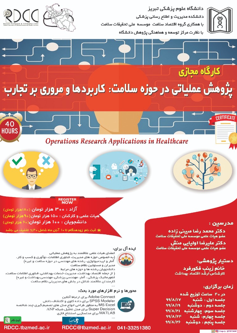 اطلاع رسانی برگزاری کارگاه مجازی "پژوهش عملیاتی در حوزه سلامت: کاربردها و مروری بر تجارب" -دانشکده مدیریت و اطلاع رسانی پزشکی تبریز