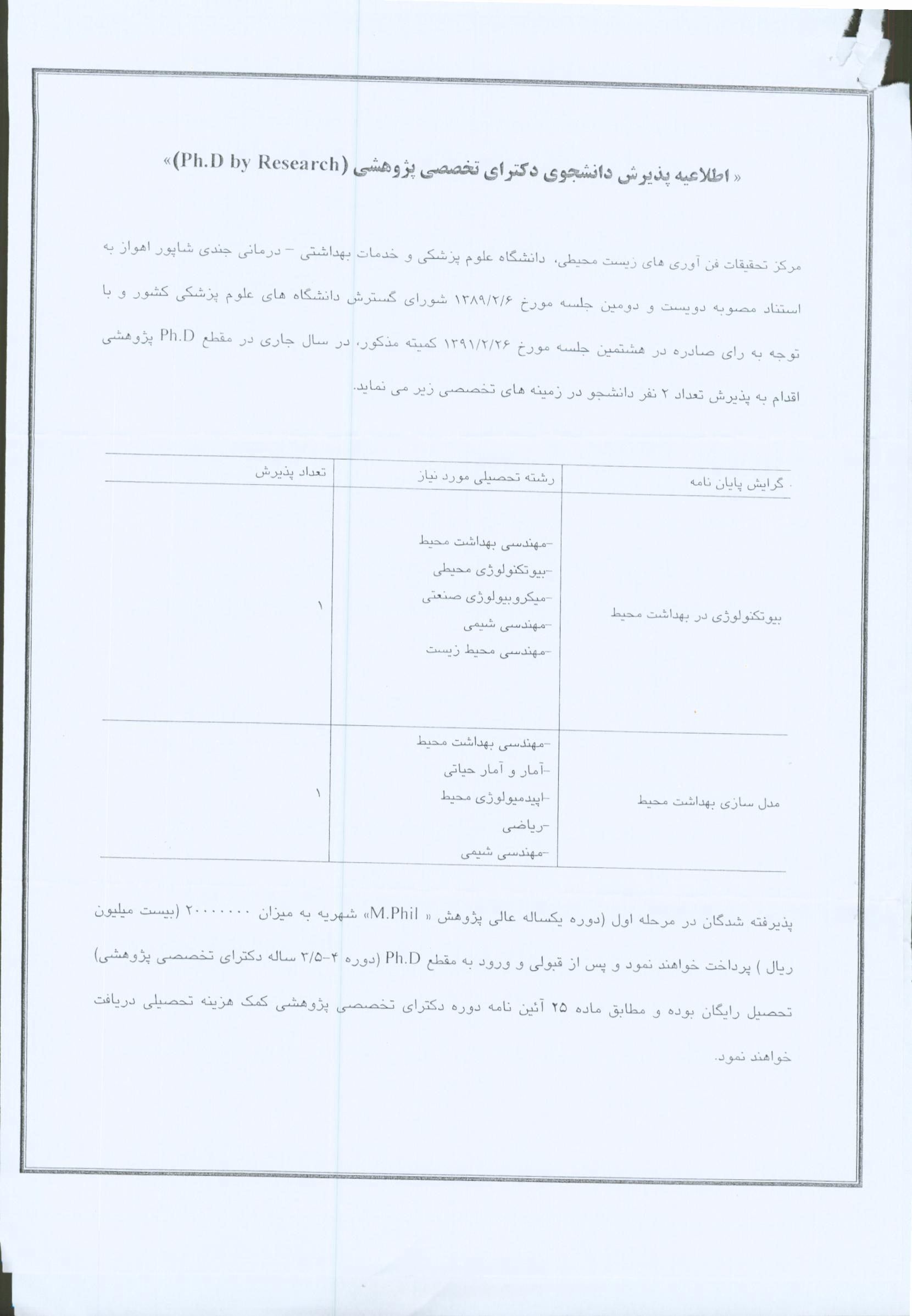 پذیرش دانشجوی دكتری پژوهشی مركز تحقیقات فن آوری های زیست محیطی در سال تحصیلی 92-91