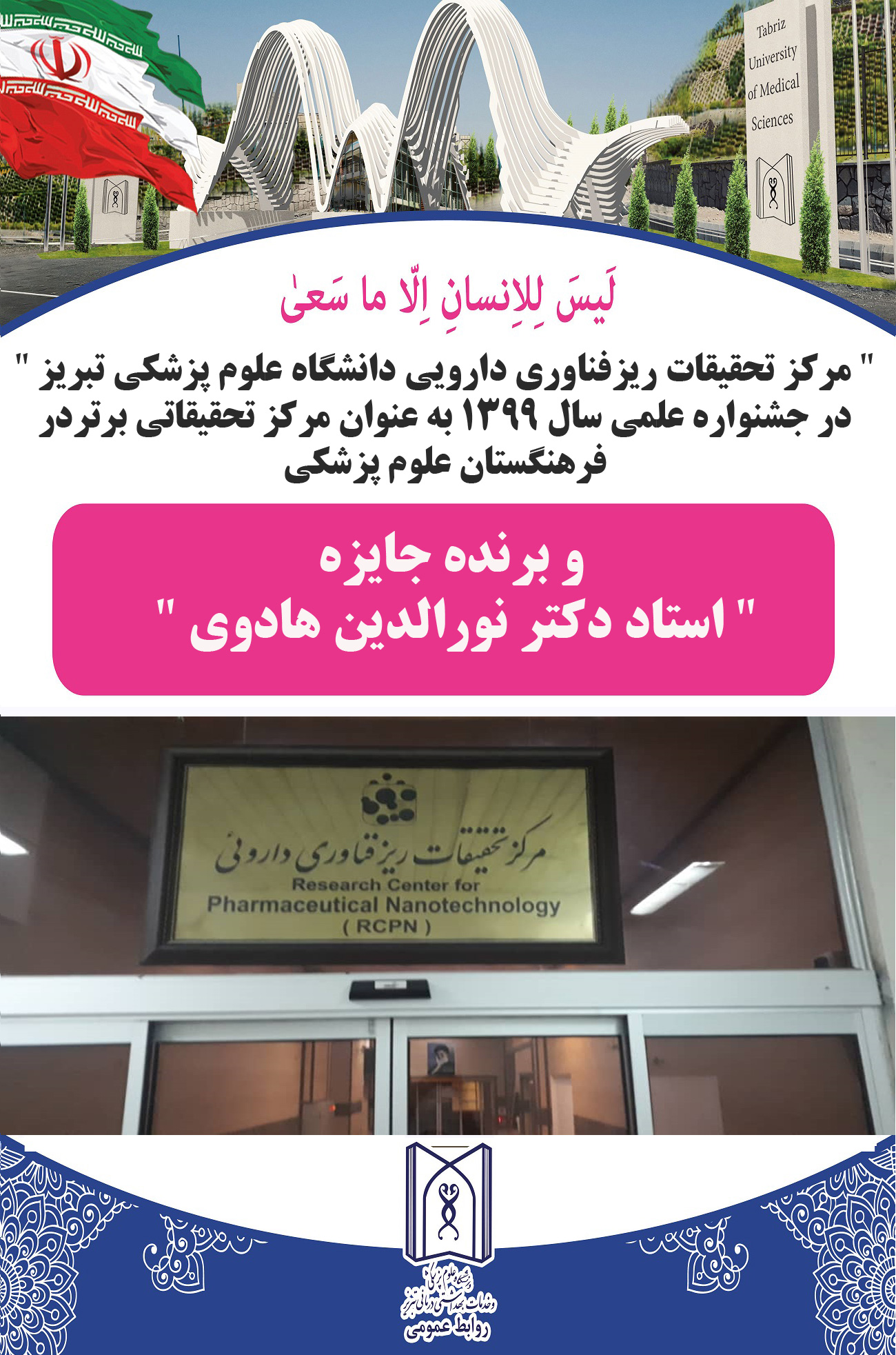 مفتخریم اعلام نماییم" مرکز تحقیقات ریز فناوری دارویی دانشگاه علوم پزشکی تبریز " در جشنواره علمی سال 1399 به عنوان مرکز تحقیقاتی برتر شناخته شده است و برنده جایزه " استاد دکتر نورالدین هادوی " می باشد که در این راستا مراسم اهدا جوایز به برگزیدگان این فرهنگستان طی مراسمی در تاریخ چهارشنبه 1399/12/06 در تالار غدیر مجموعه فرهنگستانها برگزار می شود.
