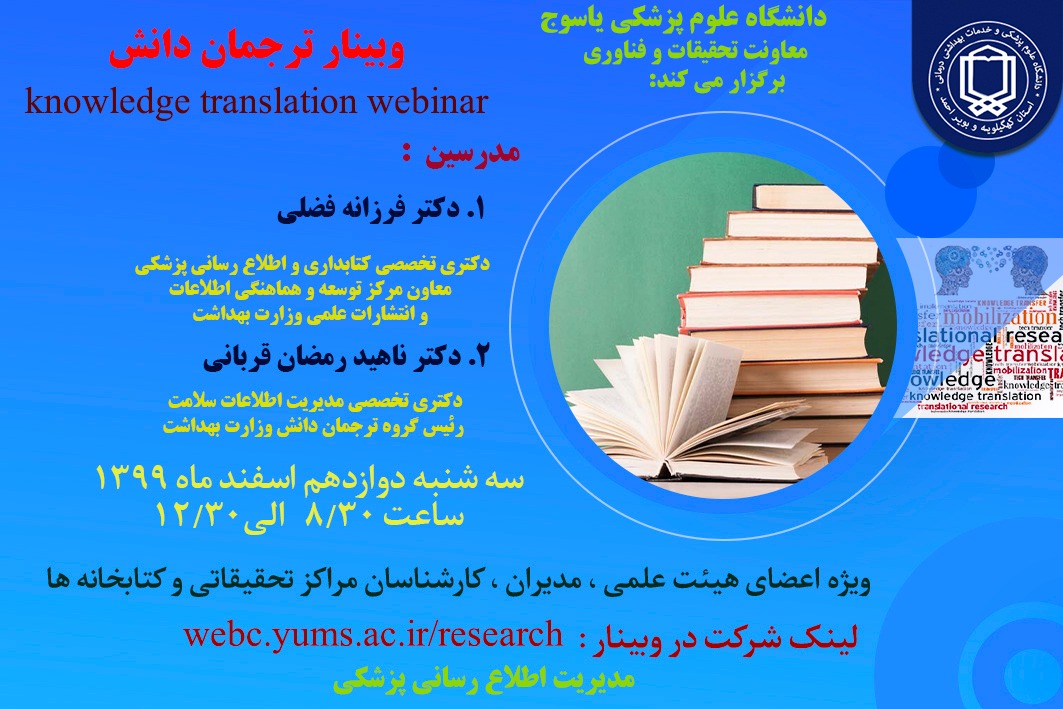 مدیریت اطلاع رسانی پزشکی دانشگاه علوم پزشکی یاسوج وبینار ترجمان دانش را در تاریخ سه شنبه دوازدهم اسفند ماه 1399 ساعت 8/30 الی 12/30برگزار می کند