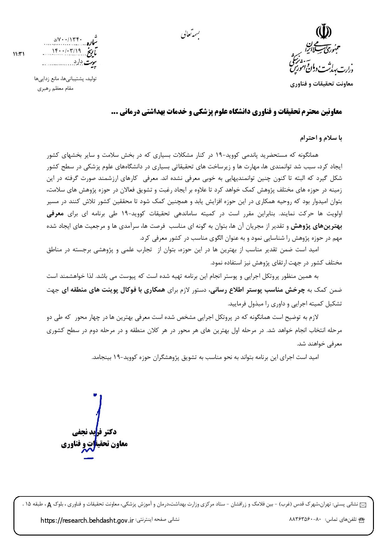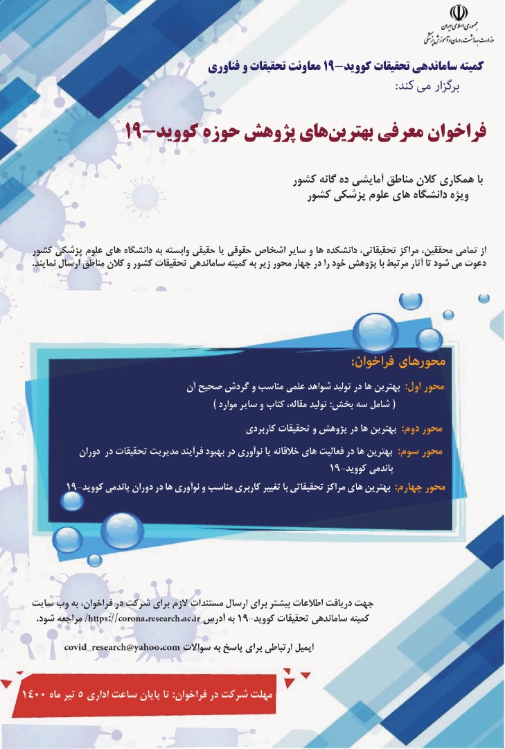 نامه فراخوان معرفی بهترین های پژوهش حوزه کووید - 19