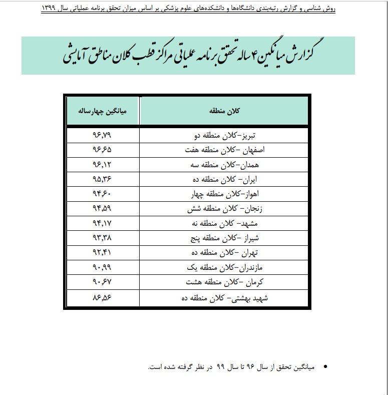 بر پایه این گزارش، دانشگاه علوم پزشکی تبریز همچنین در میانگین چهار ساله (۱۳۹۹-۱۳۹۶) با تحقق ۹۶/۷۹درصدی برنامه، صدرنشین رتبه بندی دانشگاه های قطب کلان مناطق کشور شده است. دانشگاه علوم پزشکی تبریز در سال های ۹۶، ۹۷، ۹۸ و ۹۹ به ترتیب دارای تحقق ۹۶/۴۹، ۹۴/۹۸، ۹۶/۷۶ و ۹۸/۹۴ درصدی برنامه بوده است.