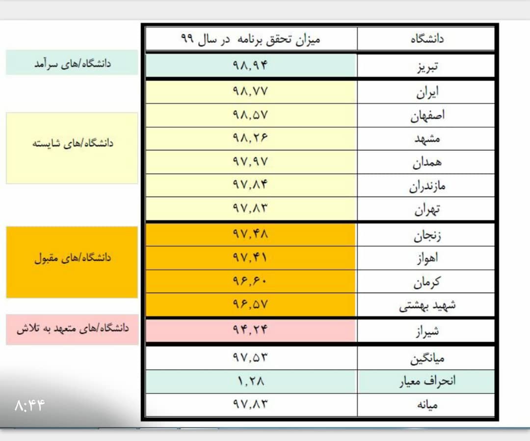 بر اساس این گزارش، دانشگاه علوم پزشکی تبریز به عنوان دانشگاه سرآمد در میان دانشگاه های قطب کلان مناطق آمایشی در تحقق برنامه عملیاتی سال ۱۳۹۹ از سوی معاونت توسعه مدیریت، منابع و برنامه ریزی وزارت بهداشت، درمان و آموزش پزشکی معرفی شد.
