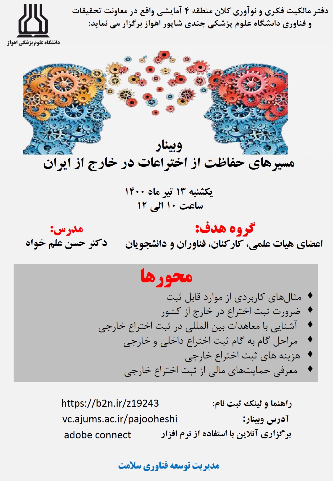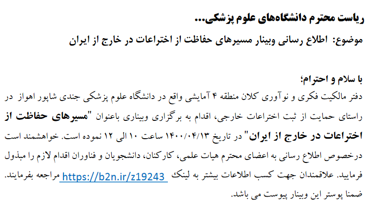 برگزاری وبینار مسیرهای حفاظت از اختراعات در خارج از ایران توسط دانشگاه علوم پزشکی اهواز