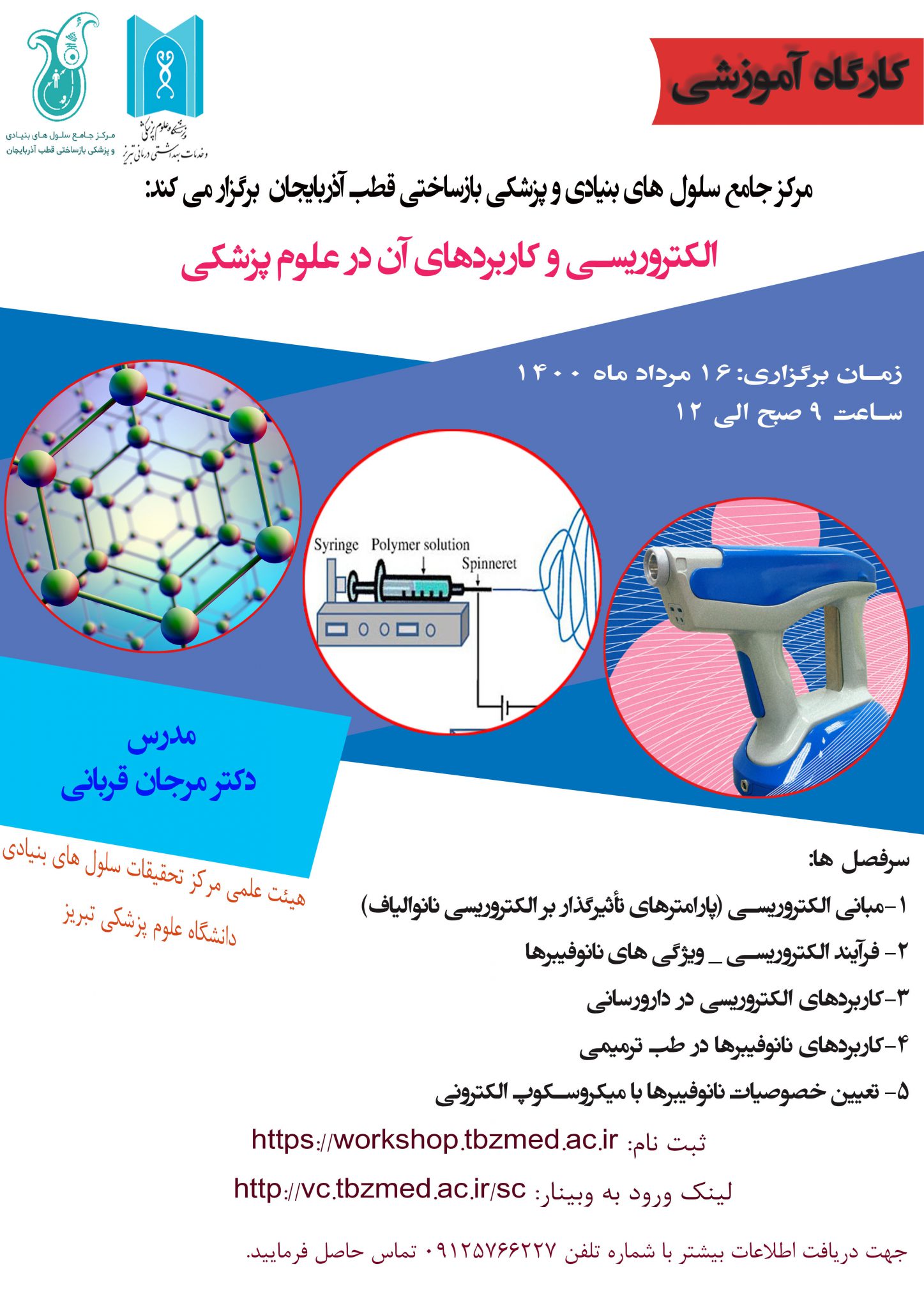 به گزارش روابط عمومی معاونت تحقیقات و فناوری به نقل از مرکز جامع سلول های بنیادی و پزشکی بازساختی قطب آذربایجان، وبینار آموزشی "الکتروریسی و کاربردهای آن در علوم پزشکی" با سخنرانی خانم دکتر مرجان قربانی در مورخه ۱۴۰۰/۰۵/۱۶ از ساعت ۹ صبح الی ۱۲ برگزار خواهد شد.