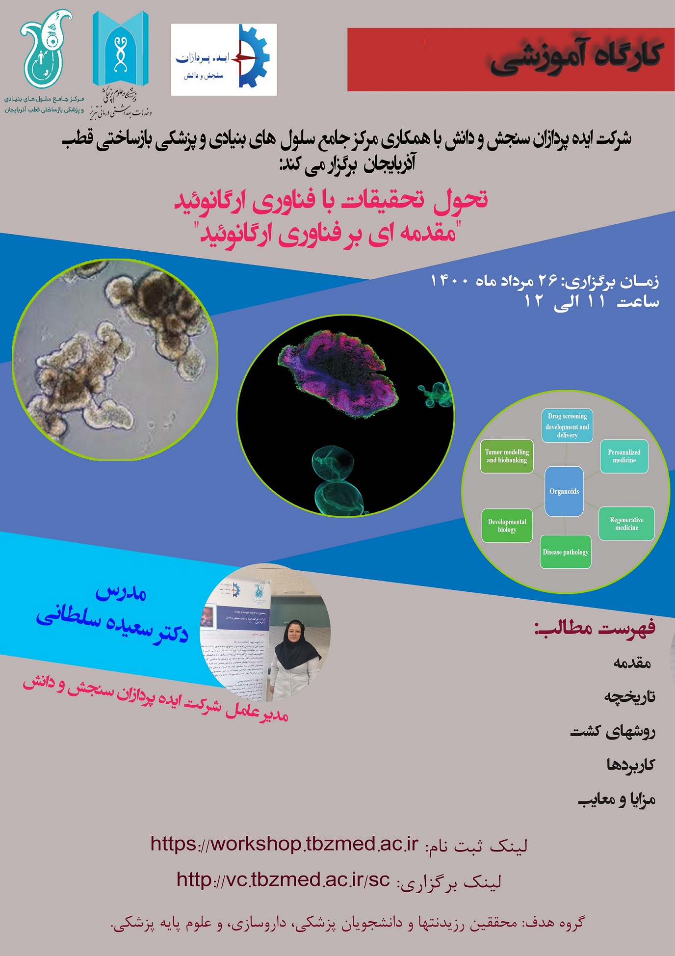 به گزارش روابط عمومی معاونت تحقیقات و فناوری به نقل از مرکز جامع سلول های بنیادی و پزشکی بازساختی قطب آذربایجان، کارگاه آموزشی تحول تحقیقات با فناوری ارگانوئید “مقدمه ای بر فناوری ارگانوئید”با همکاری شرکت ایده پردازان سنجش و دانش و مرکز جامع، با سخنرانی خانم دکترسعیده سلطانی در مورخه ۱۴۰۰/۰۵/۲۶ از ساعت ۱۱ الی ۱۲ برگزار خواهد شد.