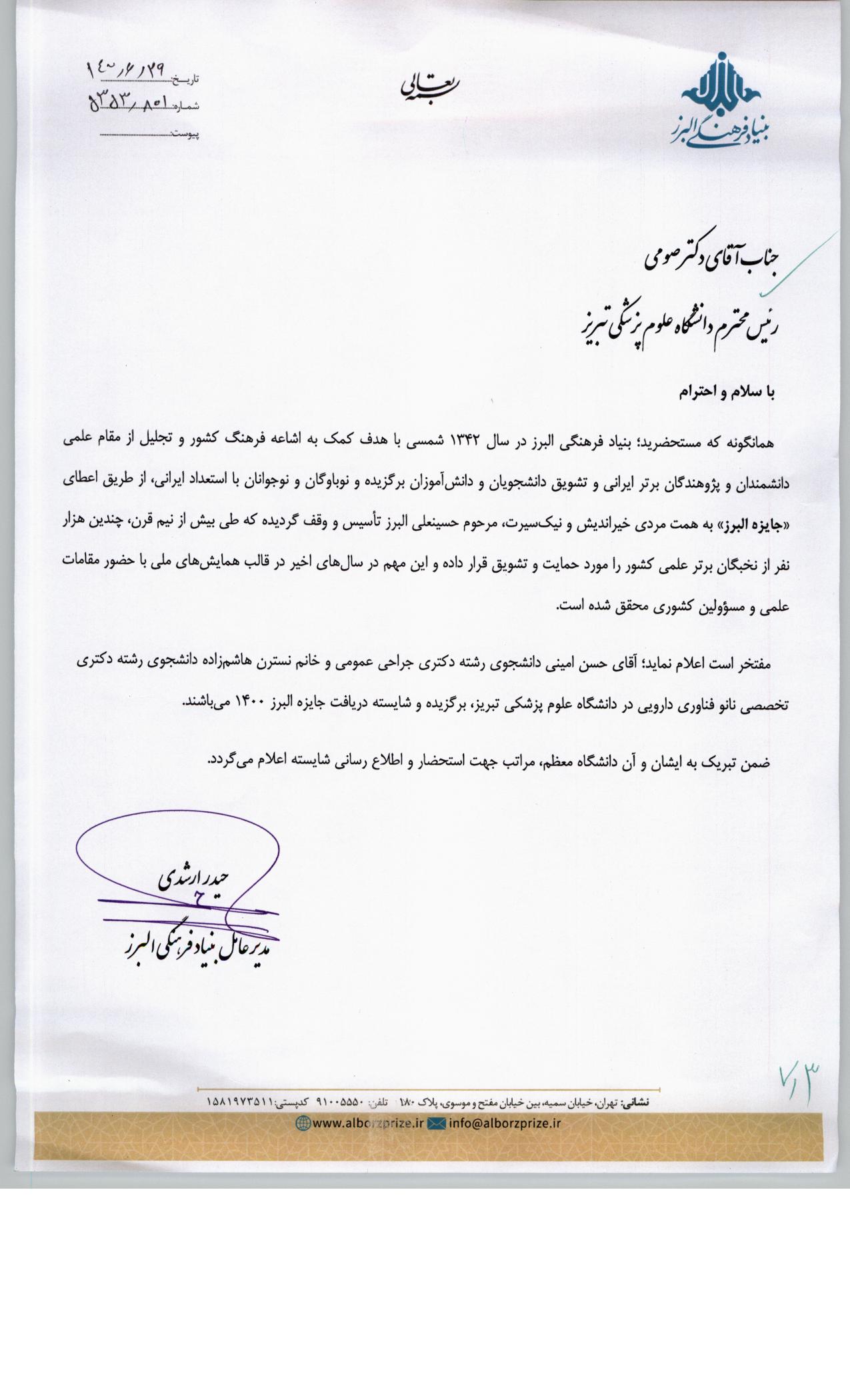 درخشش دو دانشجوی دانشگاه علوم پزشکی تبریز در جایزه البرز ۱۴۰۰