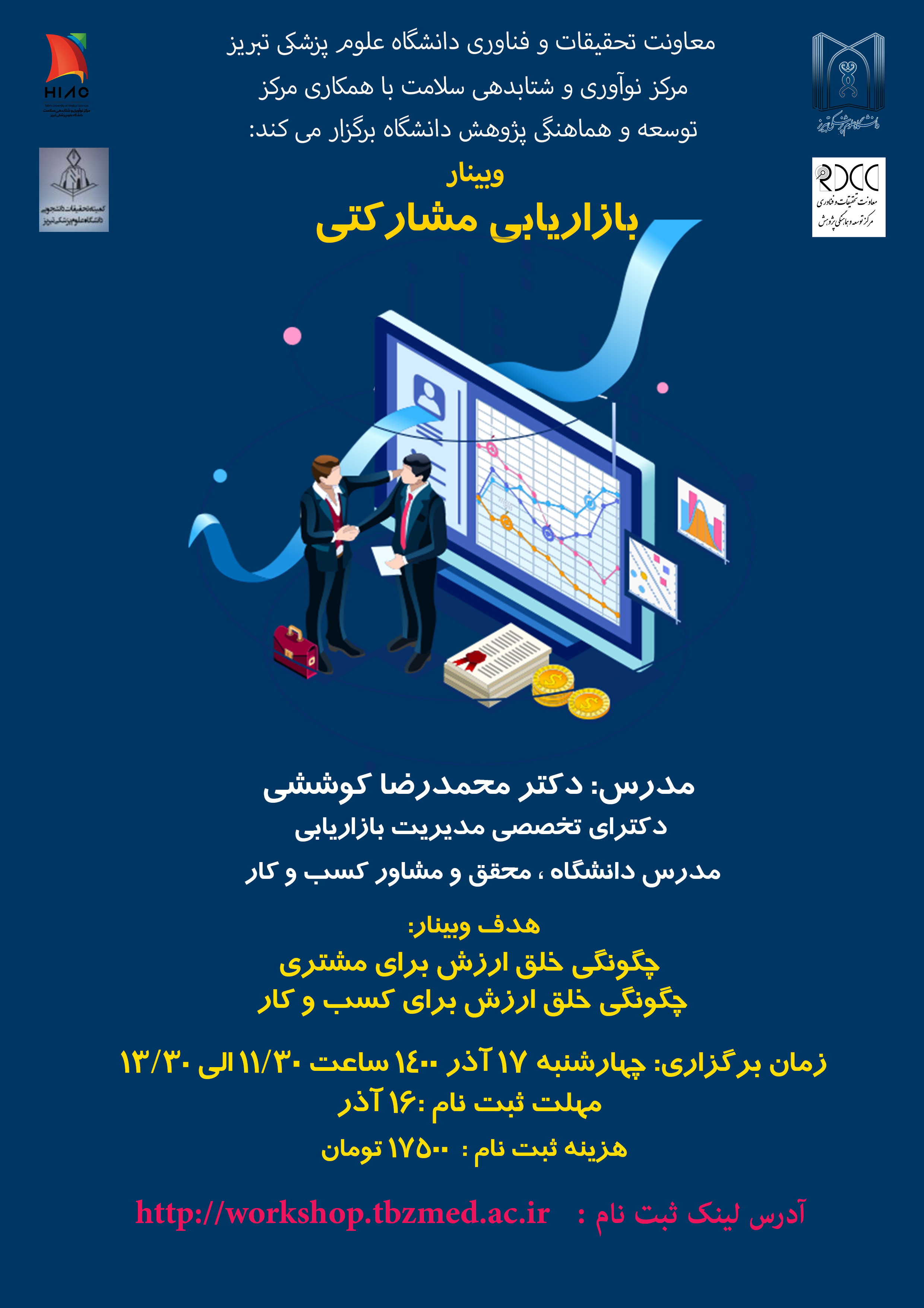 به گزارش روابط عمومی معاونت تحقیقات و فناوری به نقل از مرکز نوآوری و شتابدهی سلامت، این مرکزبا همکاری مرکز RDCC و کمیته تحقیقات دانشجویی دانشگاه علوم پزشکی تبریز وبینار " بازاریابی مشارکتی "را در تاریخ چهارشنبه ۱7 آذرماه ۱۴۰۰ ساعت 11/30 الی 13/30برگزار می نماید.