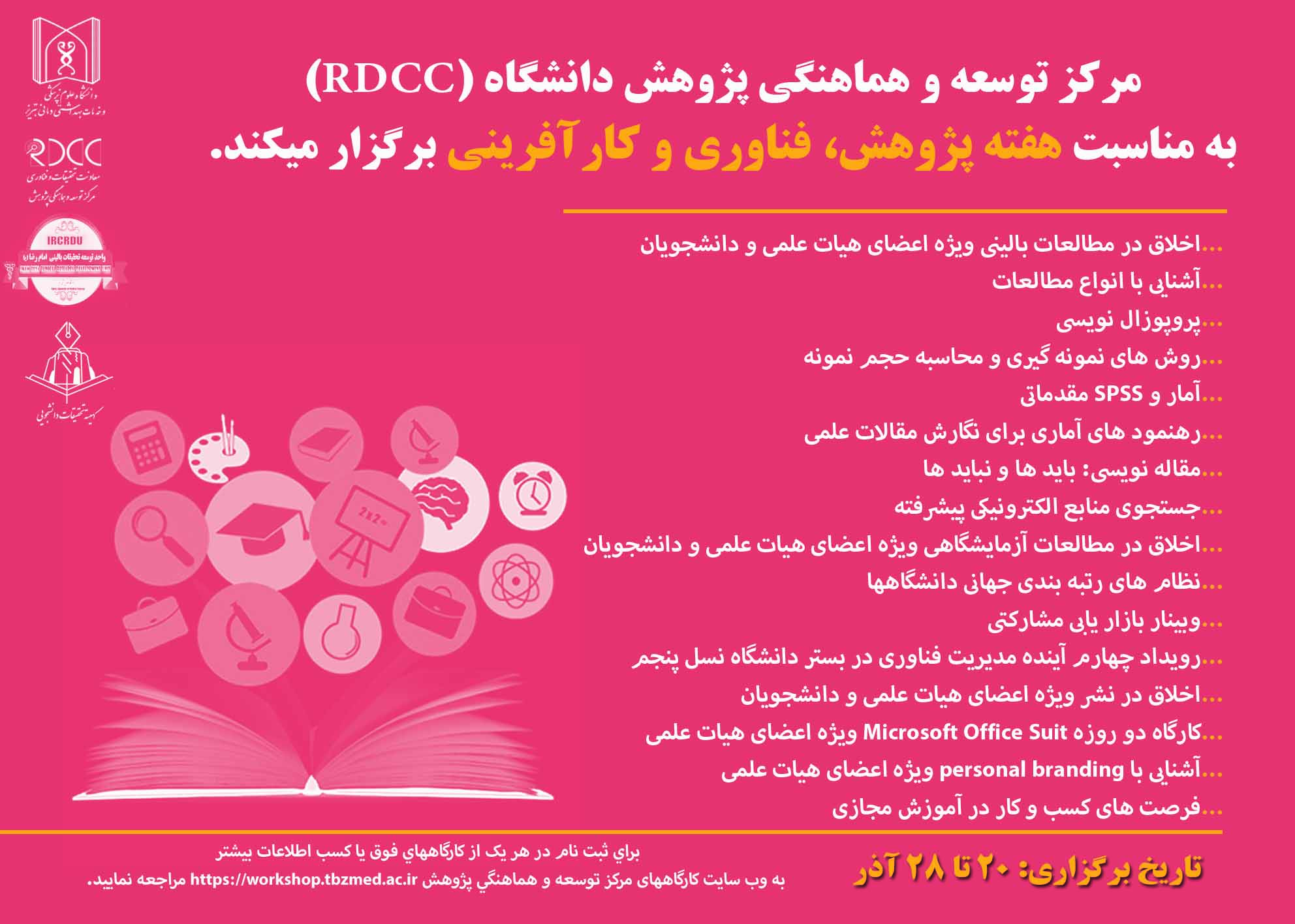 به گزارش روابط عمومی معاونت تحقیقات و فناوری به نقل از مرکز توسعه و هماهنگی پژوهش دانشگاه (RDCC)، این مرکز به مناسبت هفته پژوهش کارگاههایی را ویژه اعضای محترم هیأت علمی و دانشجویان عزیزدرتاریخ 20 الی 28 آذرماه برگزار می نماید علاقه مندان جهت کسب اطلاعات بیشتر و ثبت نام از طریق لینک زیر وارد شوند.