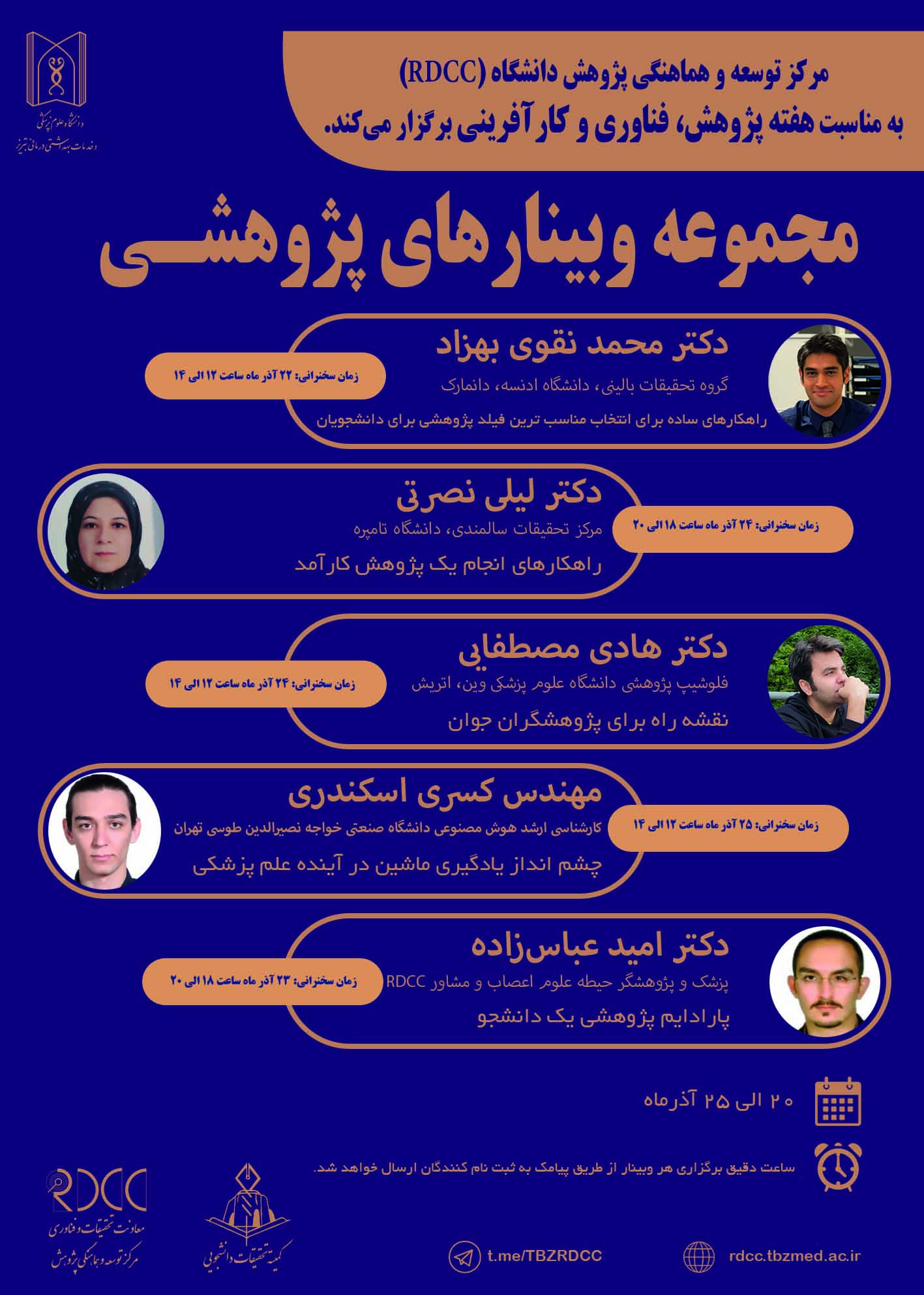 به گزارش روابط عمومی معاونت تحقیقات و فناوری به نقل از مرکز توسعه و هماهنگی پژوهش دانشگاه (RDCC)، این مرکز به مناسبت هفته پژوهش وبینارهایی را ویژه دانشجویان عزیز در تاریخ 20 الی 25 آذرماه برگزار می نماید علاقه مندان جهت کسب اطلاعات بیشتر و ثبت نام از طریق لینک زیر وارد شوند.