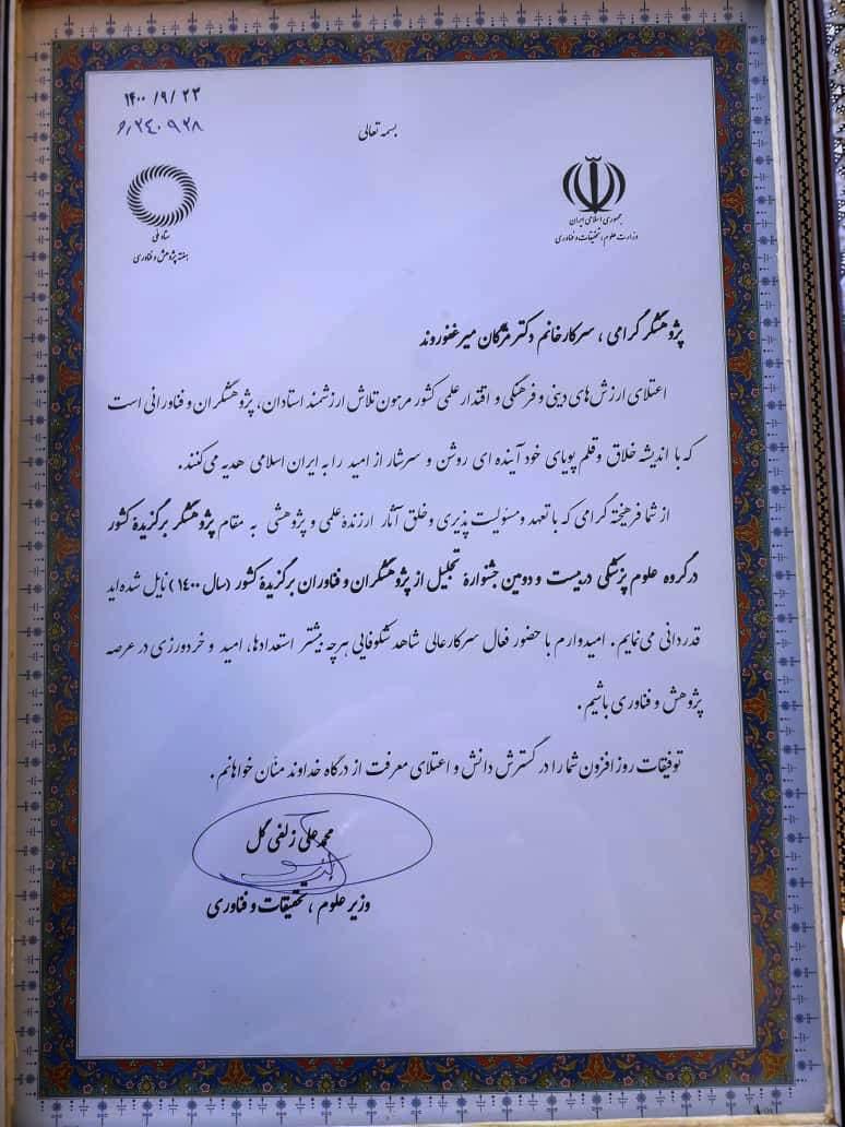 تقدیر از دکتر مژگان میرغفوروند، عضو محترم هیات علمی گروه مامایی در بیست و دومین جشنواره پژوهشگران و فناوران برتر کشور