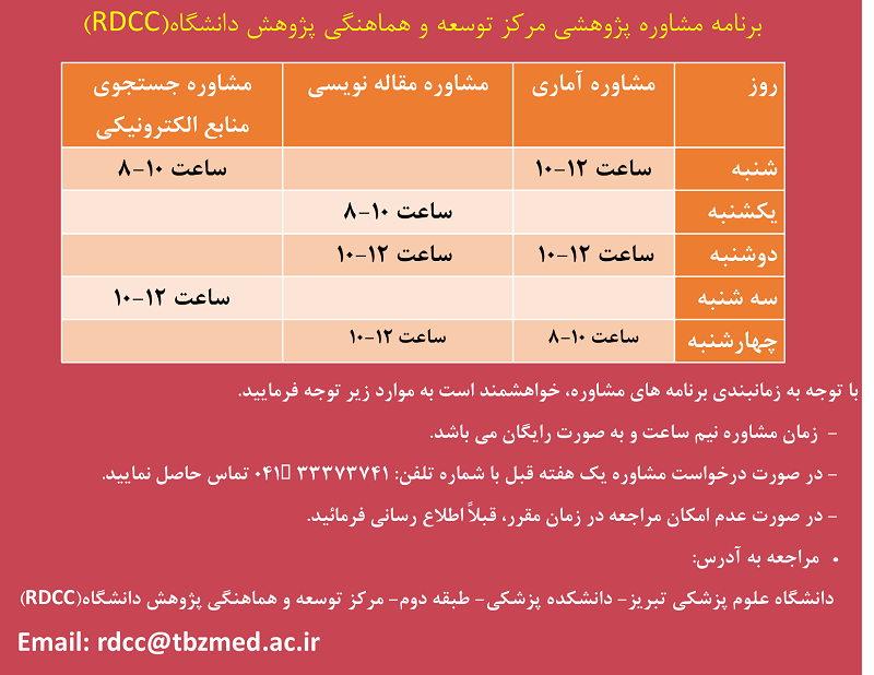 جهت بهره مندی از خدمات مشاوره ای مذکور با دفتر مرکز توسعه و هماهنگی پژوهش دانشگاه RDCC واقع در طبقه دوم دانشکده پزشکی با شماره 33373741 تماس حاصل فرمائید.