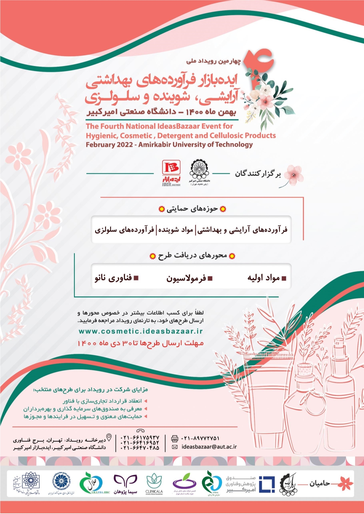 چهارمین رویداد ملی ایده بازار فرآورده های بهداشتی آرایشی، شوینده و سلولزی بهمن ماه 1400 در دانشگاه صنعتی امیرکبیر برگزار خواهد شد.